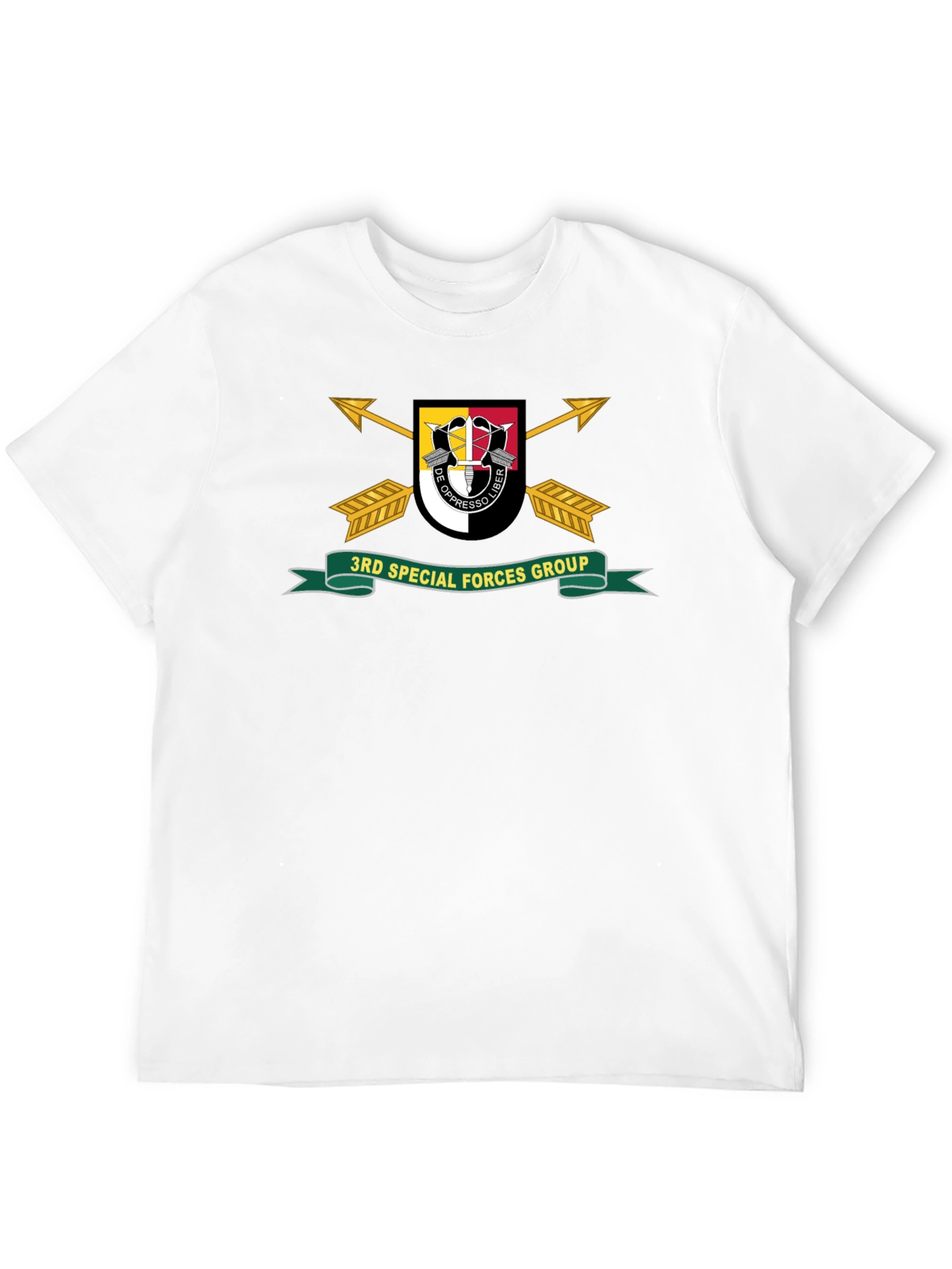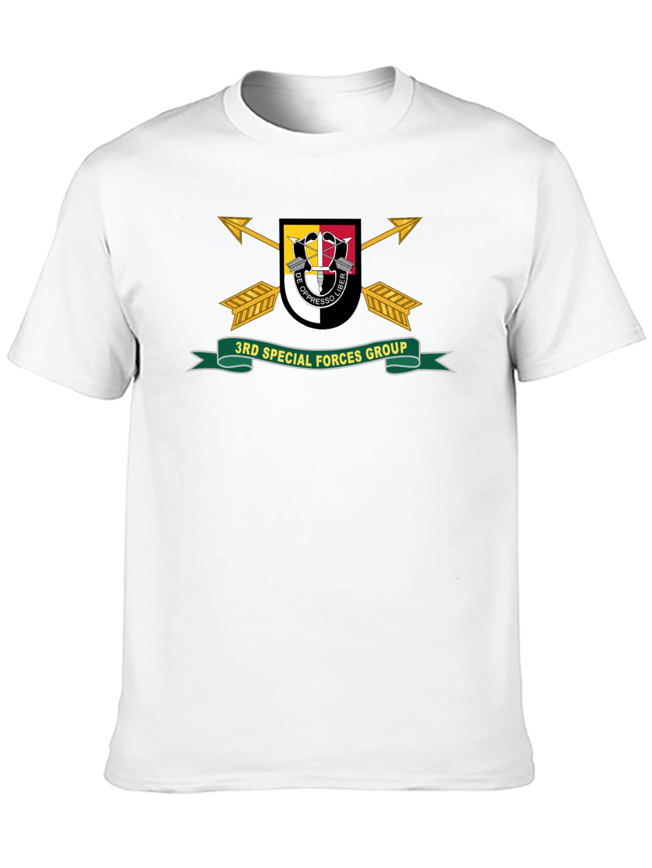 Show your support for the 3rd Special Forces Group with this striking black t-shirt. The design features the group's distinctive crest, complete with arrows, shield, and motto, prominently displayed on the front. The shirt appears to be crafted from a comfortable cotton blend, making it ideal for everyday wear or as a statement piece at military events. The high-quality print ensures the design remains vibrant wash after wash. A great way to honor the brave soldiers of the 3rd Special Forces Group, this t-shirt is a must-have for veterans, active-duty personnel, and supporters alike. Wear it with pride and show your allegiance.