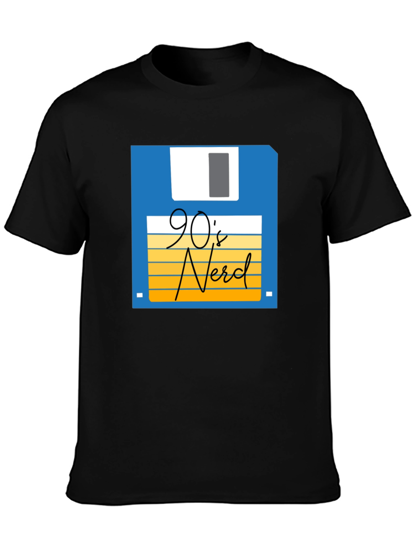 Show off your love for retro technology with this eye-catching 90's Nerd T-shirt! This black tee features a vibrant graphic of a classic floppy disk, complete with a nostalgic yellow and blue design and a playful "90's Nerd" slogan. Made from comfortable, breathable fabric, this t-shirt is perfect for casual wear, tech meetups, or simply expressing your unique style. The standout design is sure to spark conversations and bring back memories of the good old days of computing. This tee is the perfect gift for anyone who loves vintage tech, 90s nostalgia, or just wants to add a fun and quirky piece to their wardrobe.
