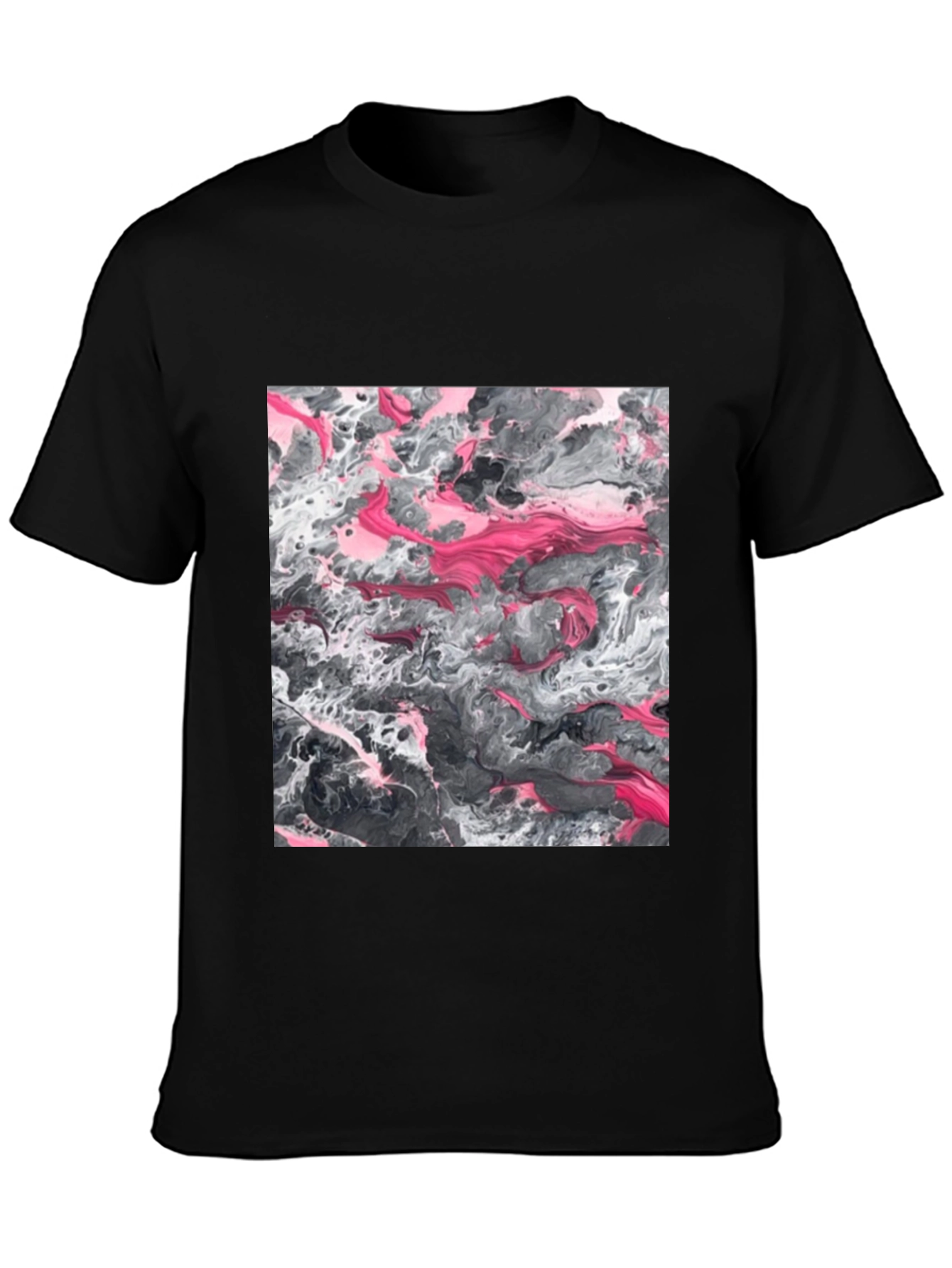 Elevate your everyday style with this eye-catching abstract art graphic tee. This black unisex t-shirt features a unique and mesmerizing design in shades of gray, white, and vibrant pink, creating a bold statement. The abstract pattern gives an artsy touch, making it a great piece to express your individuality. Made from soft, breathable fabric, this t-shirt offers all-day comfort. Perfect for casual outings, art events, or simply adding a pop of color to your wardrobe. Pair it with jeans, shorts, or skirts for a trendy and effortlessly cool look.