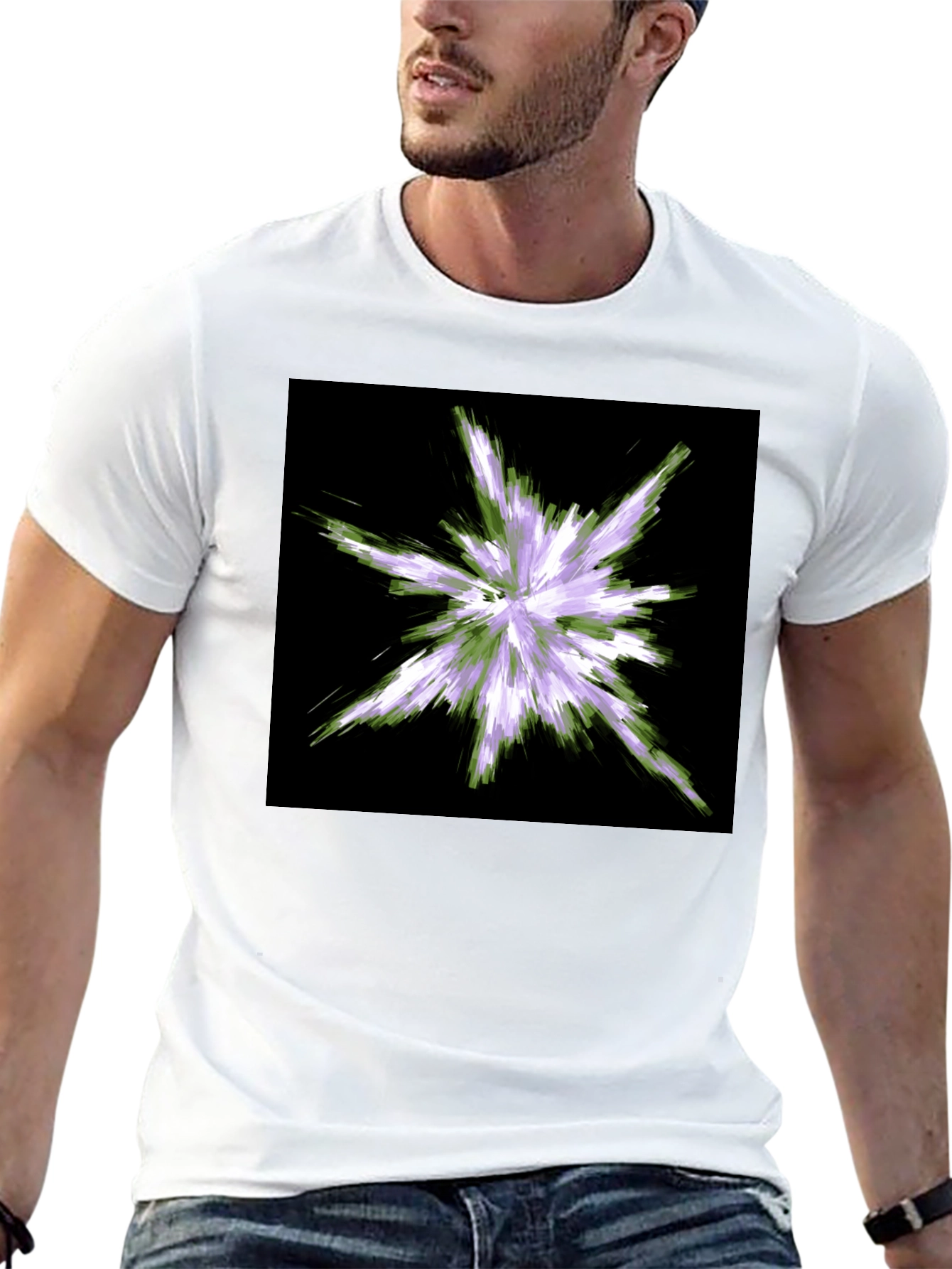 Elevate your style with this eye-catching black t-shirt featuring a unique abstract burst design. The central graphic, set against a contrasting black backdrop, showcases an explosion of light lavender and green hues. The vivid design adds a modern and artistic flair, making it a standout piece in your wardrobe. Made from comfortable, breathable fabric, this t-shirt is perfect for casual wear, adding a touch of individuality to any outfit. Ideal for those who appreciate contemporary art and bold fashion statements. Step out in style and make a lasting impression with this distinct graphic tee.