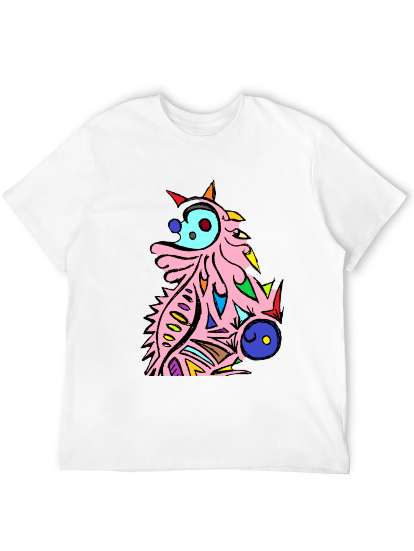 Elevate your casual wear with this eye-catching black t-shirt. Featuring a vibrant, abstract cartoon creature design, this tee is sure to turn heads. The unique graphic boasts a pink body with colorful geometric accents in red, blue, yellow and white. Made from comfortable, breathable fabric, it's perfect for everyday wear. Showcase your unique style with this standout piece, ideal for casual outings, concerts, or simply lounging around. Add a playful touch to your wardrobe with this artistic and expressive t-shirt. Pair it with your favorite jeans or shorts for an effortlessly cool look.