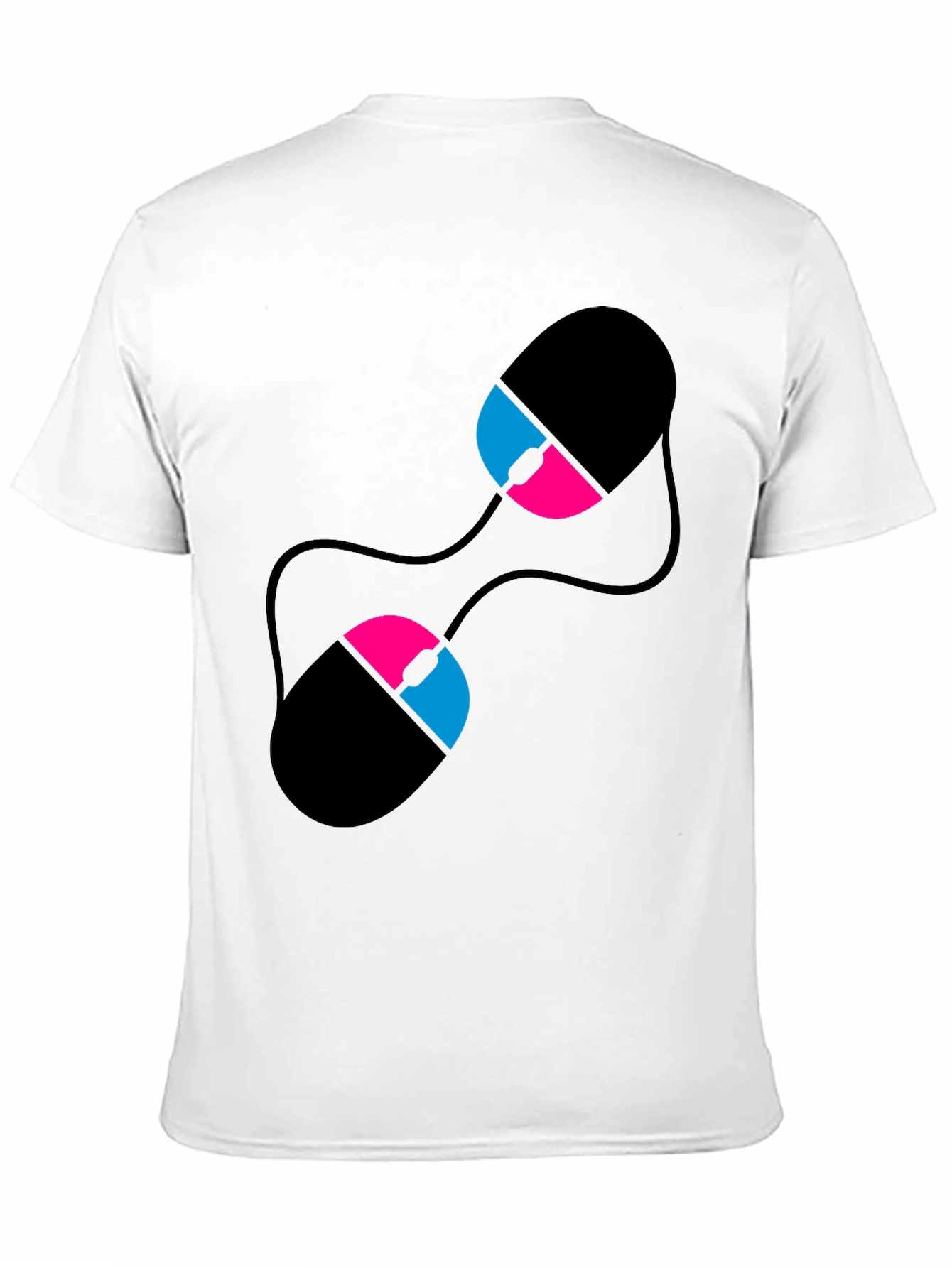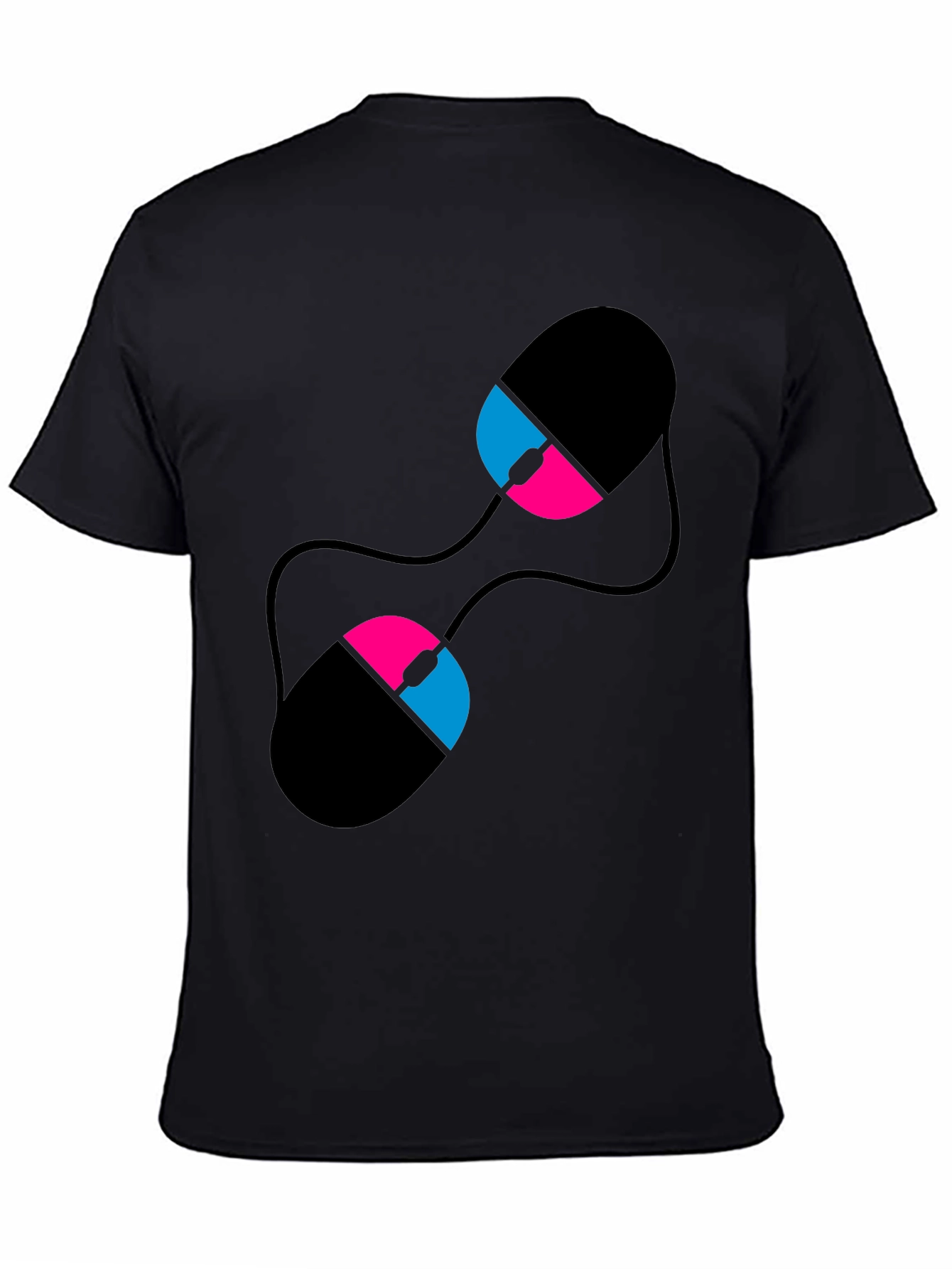 Show off your unique style with this eye-catching black t-shirt. This shirt features a creative graphic design of two computer mice, rendered in black, pink, and blue. The stylized artwork adds a modern and playful touch, making it perfect for tech enthusiasts or anyone who appreciates bold, abstract designs. Made from a comfortable fabric, this tee is ideal for everyday wear. Its versatile style allows you to pair it with jeans for a casual look, or dress it up with a blazer for a more edgy outfit. Whether you're at a coding meetup or just hanging out with friends, this t-shirt is sure to make a statement.