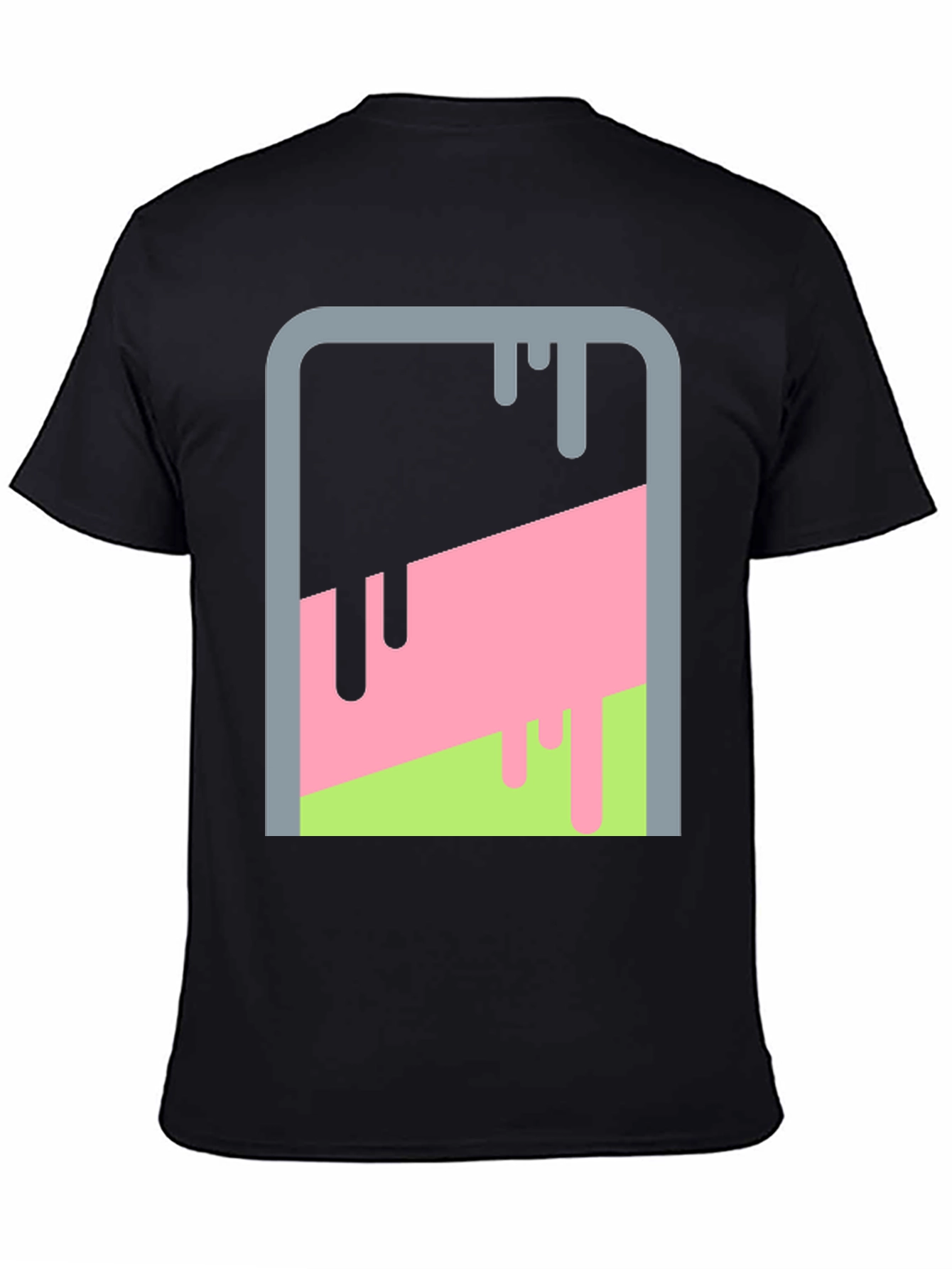 Show off your artistic side with this unique men's black T-shirt featuring an abstract dripping paint design. The graphic showcases a bold composition of black, pink, and lime green hues contained within a gray, rounded rectangular frame, creating an eye-catching visual. Made from a comfortable, breathable fabric, this tee is perfect for everyday wear. Whether you're hanging out with friends, hitting the streets, or expressing your individuality, this versatile T-shirt is a stylish choice. Add a pop of color and artistic flair to your wardrobe with this trendy graphic tee.