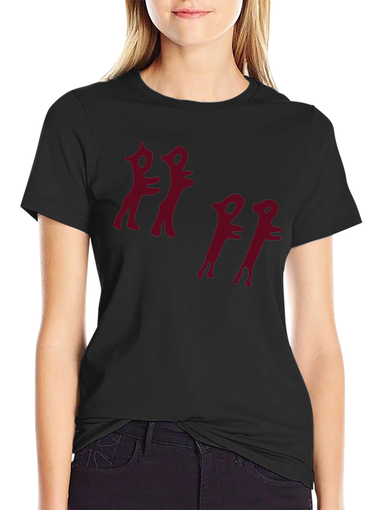 This eye-catching black t-shirt features a unique and abstract graphic design. The design consists of two pairs of maroon figures, adding a touch of artistic flair to your casual wardrobe. Made from a comfortable-looking fabric, this tee is perfect for everyday wear. Its simple yet stylish design makes it versatile and easy to pair with jeans, shorts, or joggers. Stand out from the crowd with this original t-shirt, perfect for those who appreciate modern art and unique fashion. This tee would also be a great gift for anyone with an eclectic sense of style.