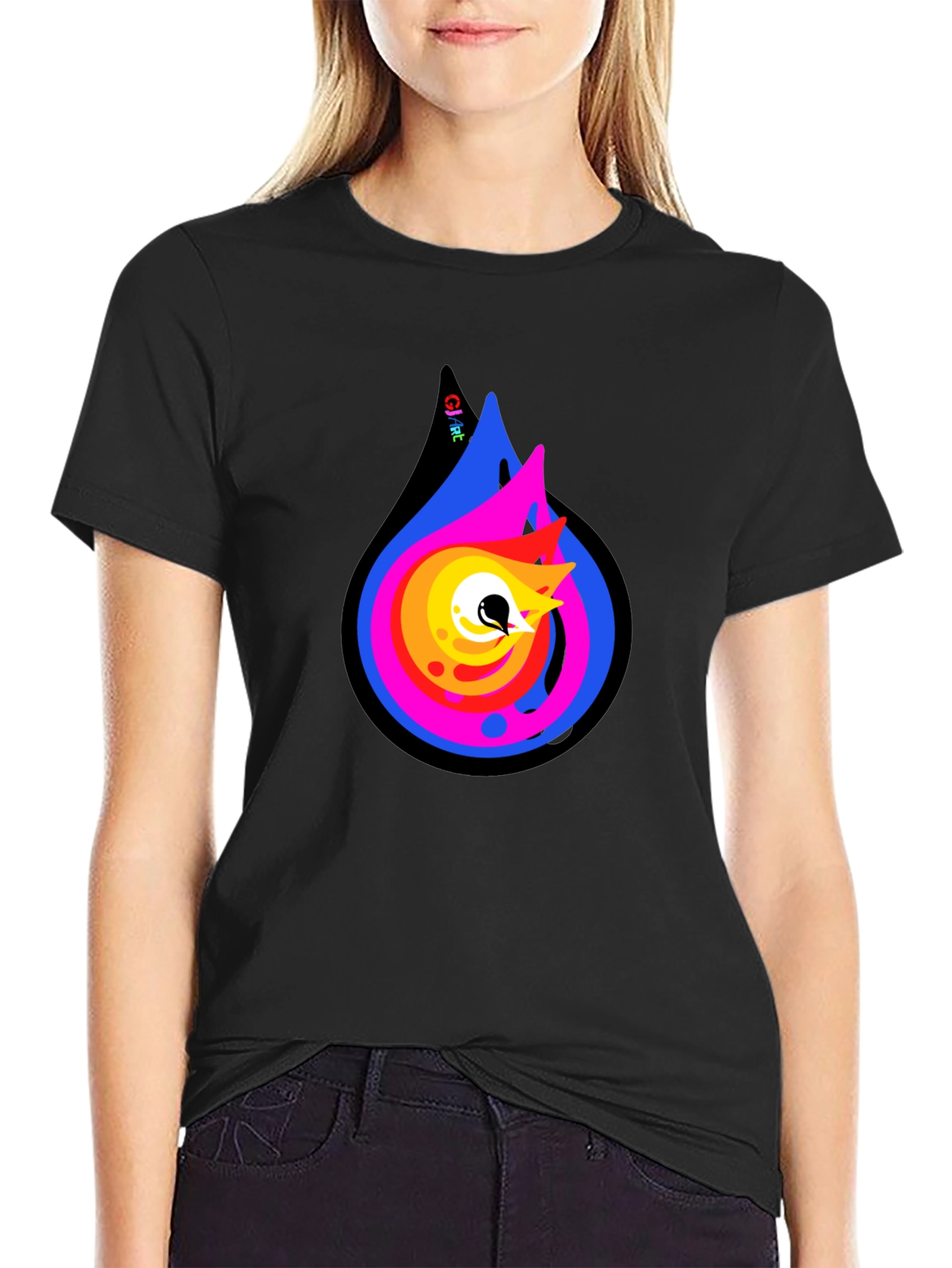 Elevate your casual style with this eye-catching black t-shirt. Featuring a bold, abstract flame graphic in vibrant blues, pinks, yellows, and oranges, this shirt is a statement piece. The design incorporates an artistic eye element, adding intrigue. Made from a comfortable, breathable fabric, it's perfect for everyday wear. Pair with jeans or shorts for a standout look. This unique tee is ideal for those who love distinctive designs and want to express their individuality. A must-have addition to any modern wardrobe.