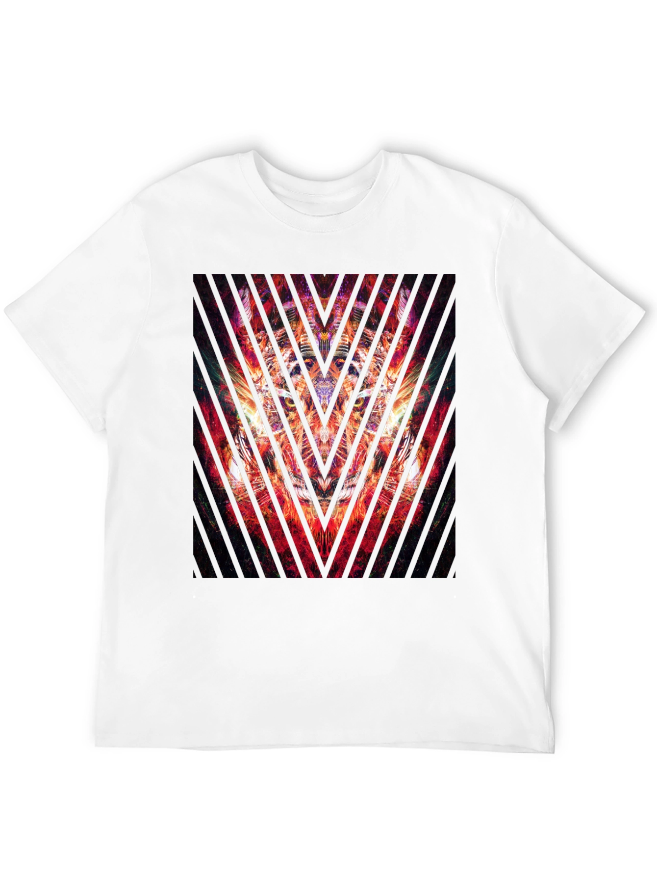 Make a bold statement with this striking black t-shirt. Featuring an abstract graphic print in vibrant red and orange tones, this tee is sure to turn heads. The geometric design adds a modern edge, making it perfect for casual outings or a night out. Made from comfortable materials, this shirt provides a great fit and feel. Pair it with jeans or shorts for an effortlessly cool look. Ideal for those who appreciate unique and eye-catching designs, this t-shirt is a must-have addition to your wardrobe.
