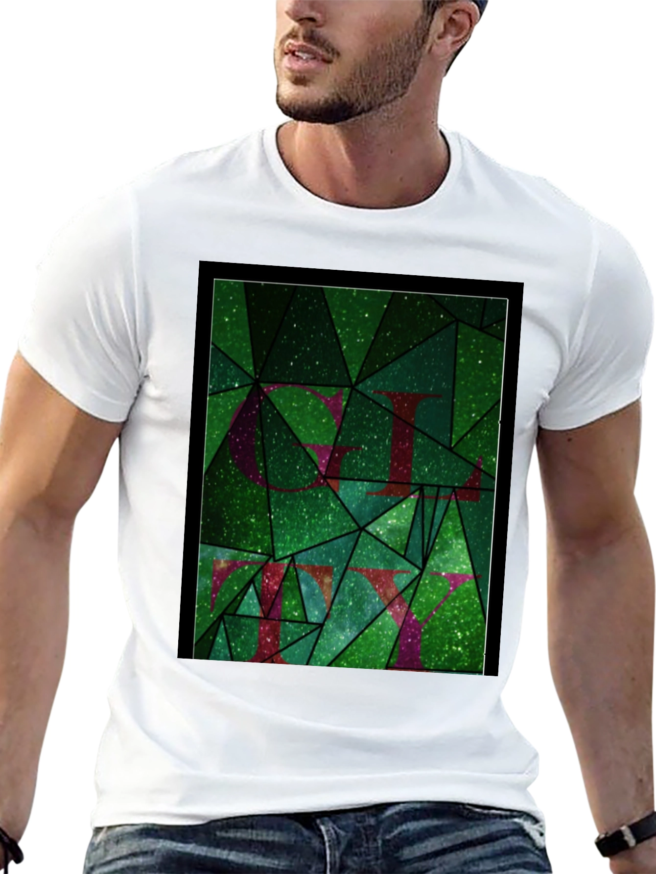 This striking black tee features a vibrant geometric design. The graphic showcases a mosaic of green triangles with a subtle glittery texture. Bold, stylized letters are integrated into the pattern, adding depth and visual interest. Crafted from a comfortable, breathable fabric, this tee is perfect for casual wear. The unique design makes it a standout piece, ideal for expressing your individuality. Pair it with jeans or shorts for a relaxed yet stylish look. Elevate your wardrobe with this eye-catching graphic tee and make a statement wherever you go.