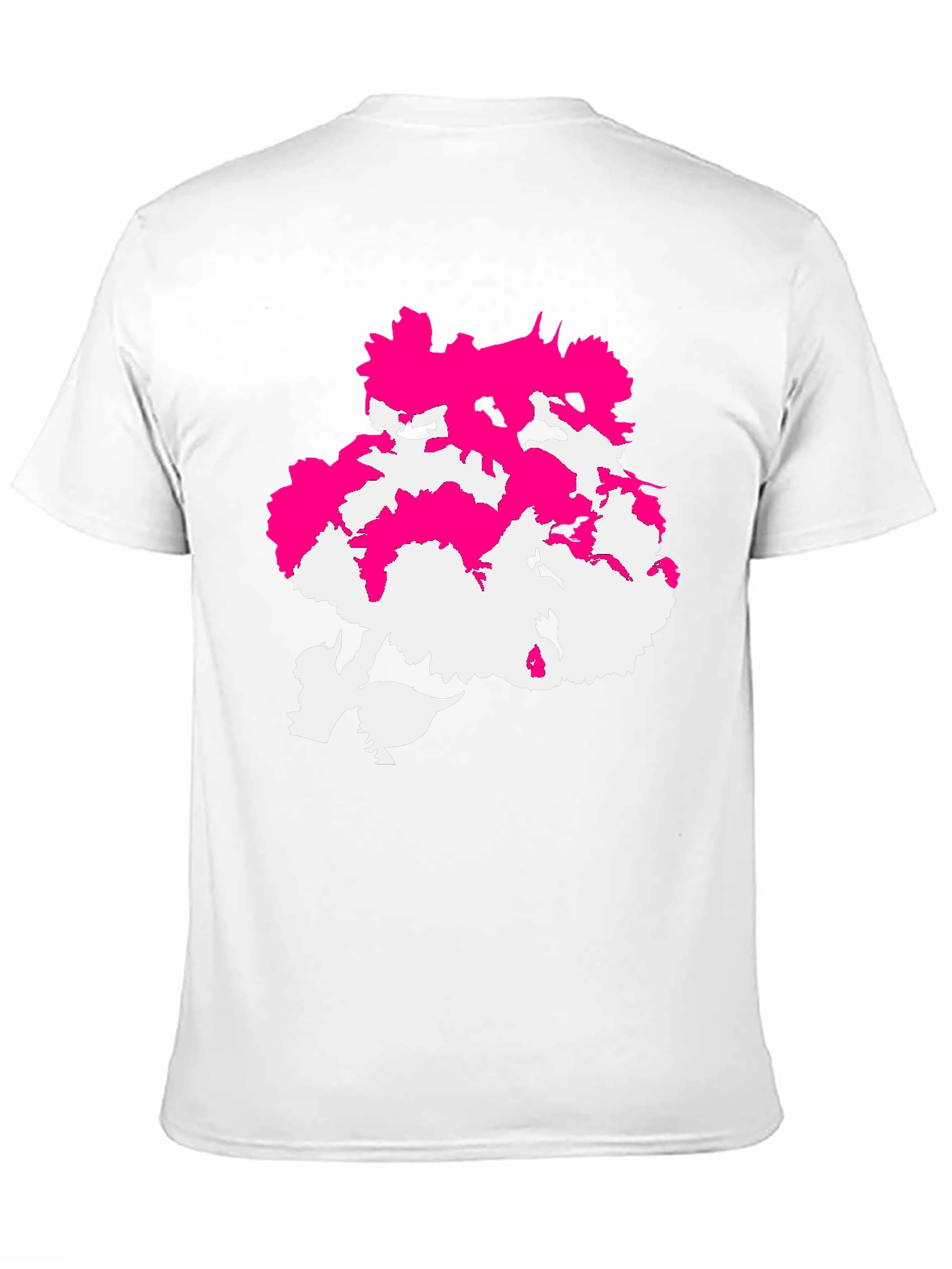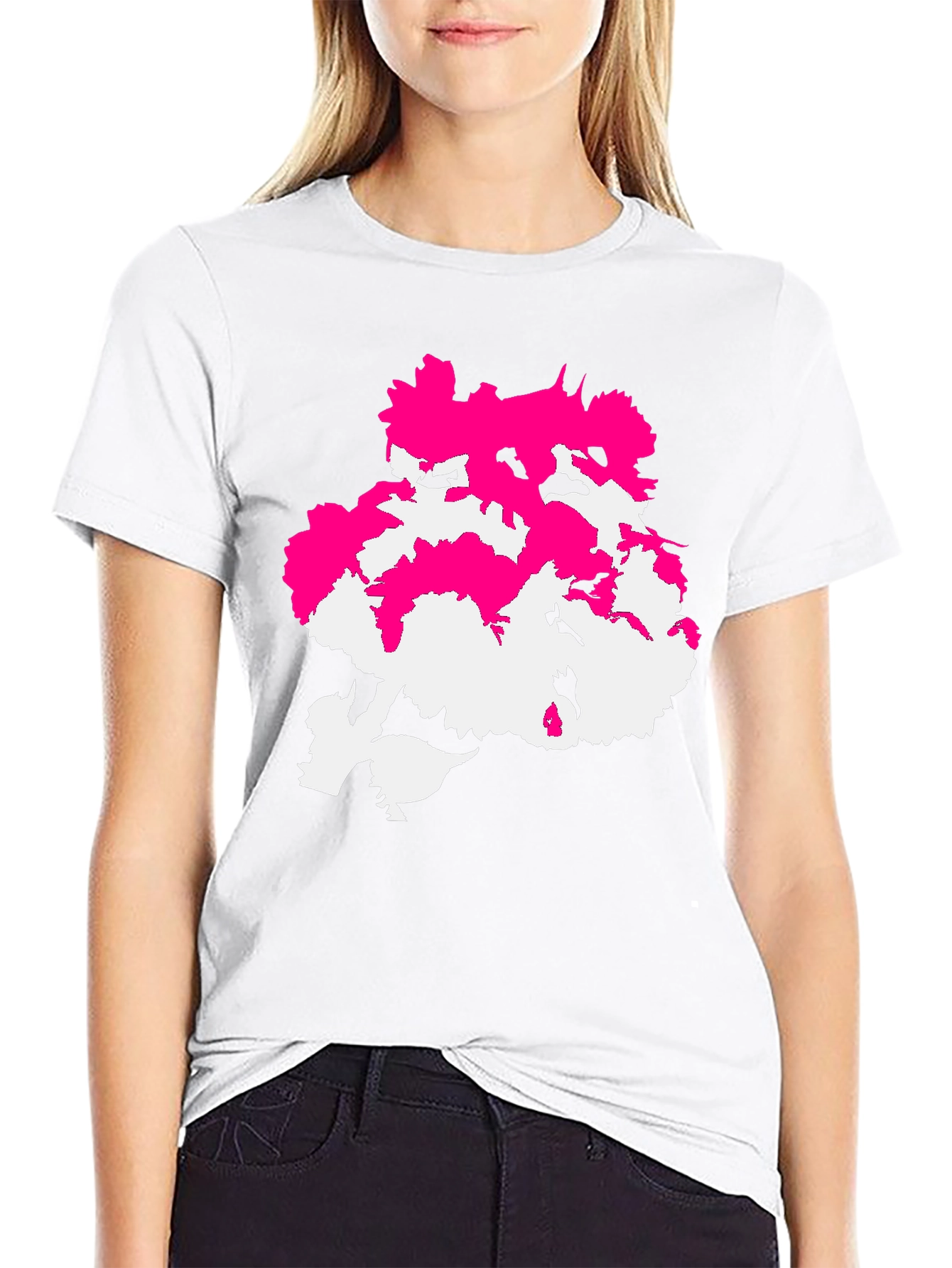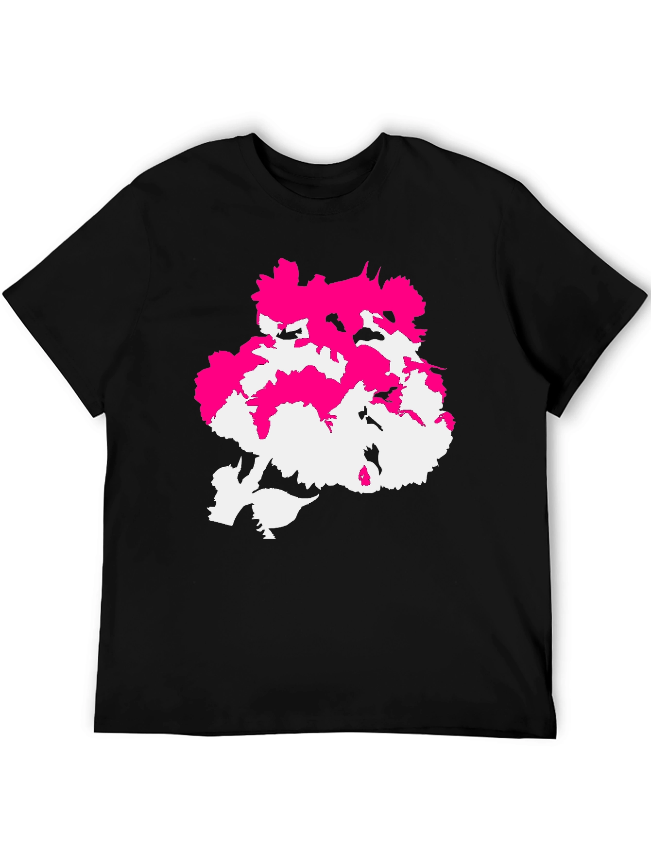 Make a bold statement with this eye-catching black t-shirt featuring a unique abstract design. The graphic combines vibrant pink and stark white elements, creating a visually striking contrast against the dark background. The design is centrally placed, commanding attention and adding a modern edge to your everyday look. Crafted from a comfortable-looking fabric, this tee promises both style and ease. Perfect for casual outings, concerts, or adding a pop of artistic flair to any outfit. Wear your individuality with this distinctive tee!