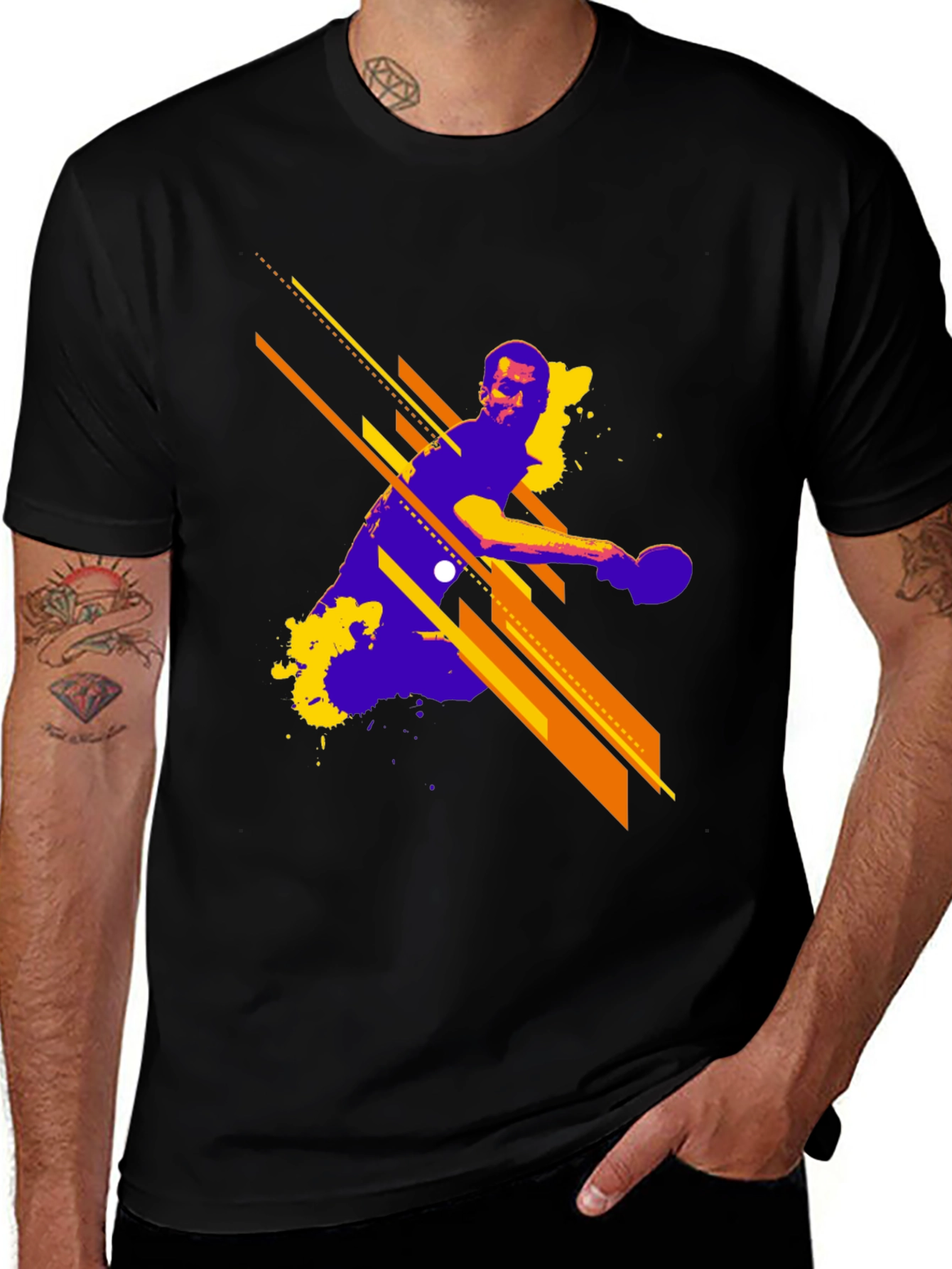 Serve up style with this unique graphic t-shirt. Featuring an abstract design of a table tennis player in action, rendered in a striking purple, orange, and yellow color scheme, it's a guaranteed conversation starter. Made from a comfortable, breathable fabric, this black tee is perfect for casual wear, sports enthusiasts, or anyone looking to add a touch of artistic flair to their wardrobe. Stand out from the crowd with this eye-catching piece that combines comfort and bold design. Ideal for a relaxed weekend, game night, or as a gift for the ping pong lover in your life.