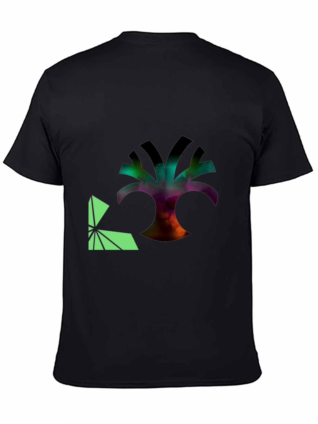 Show off your unique style with this eye-catching black t-shirt. This modern tee features a bold graphic design of an abstract tree in vibrant, blurred colors, accented by a geometric green element. Made from a comfortable, breathable fabric, this shirt is perfect for casual outings, concerts, or everyday wear. The striking design is sure to make a statement wherever you go. Pair it with jeans or shorts for a stylish, effortless look. Add a touch of artistic flair to your wardrobe with this must-have t-shirt!