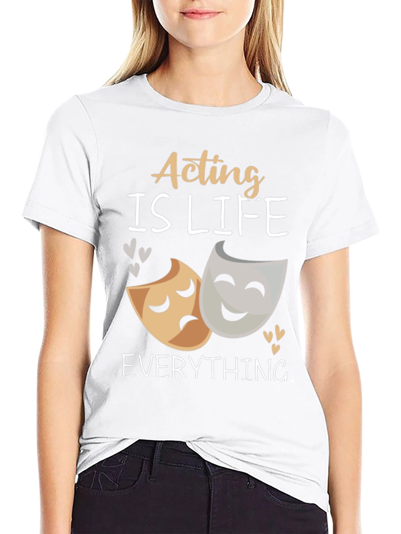 Show your passion for the theatre with this eye-catching black t-shirt. The design features the phrase "Acting Is Life EVERYTHING" in a mix of gold and white lettering. Below the text are two theatrical masks, one in a sorrowful beige tone and the other in a cheerful silver color. Little hearts are scattered around the masks. Made from a soft, comfortable fabric, this tee is perfect for actors, drama students, theatre enthusiasts, or anyone who appreciates the art of performance. Wear it to rehearsals, performances, or casual outings to express your love for acting.