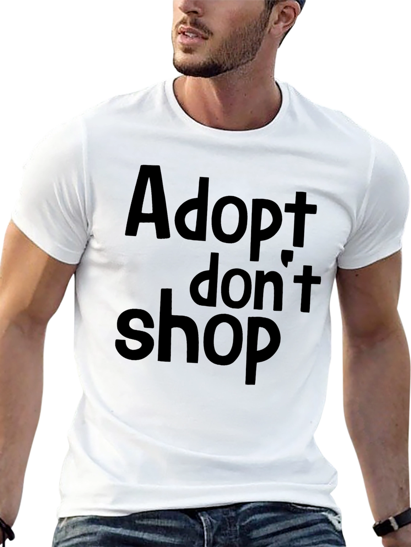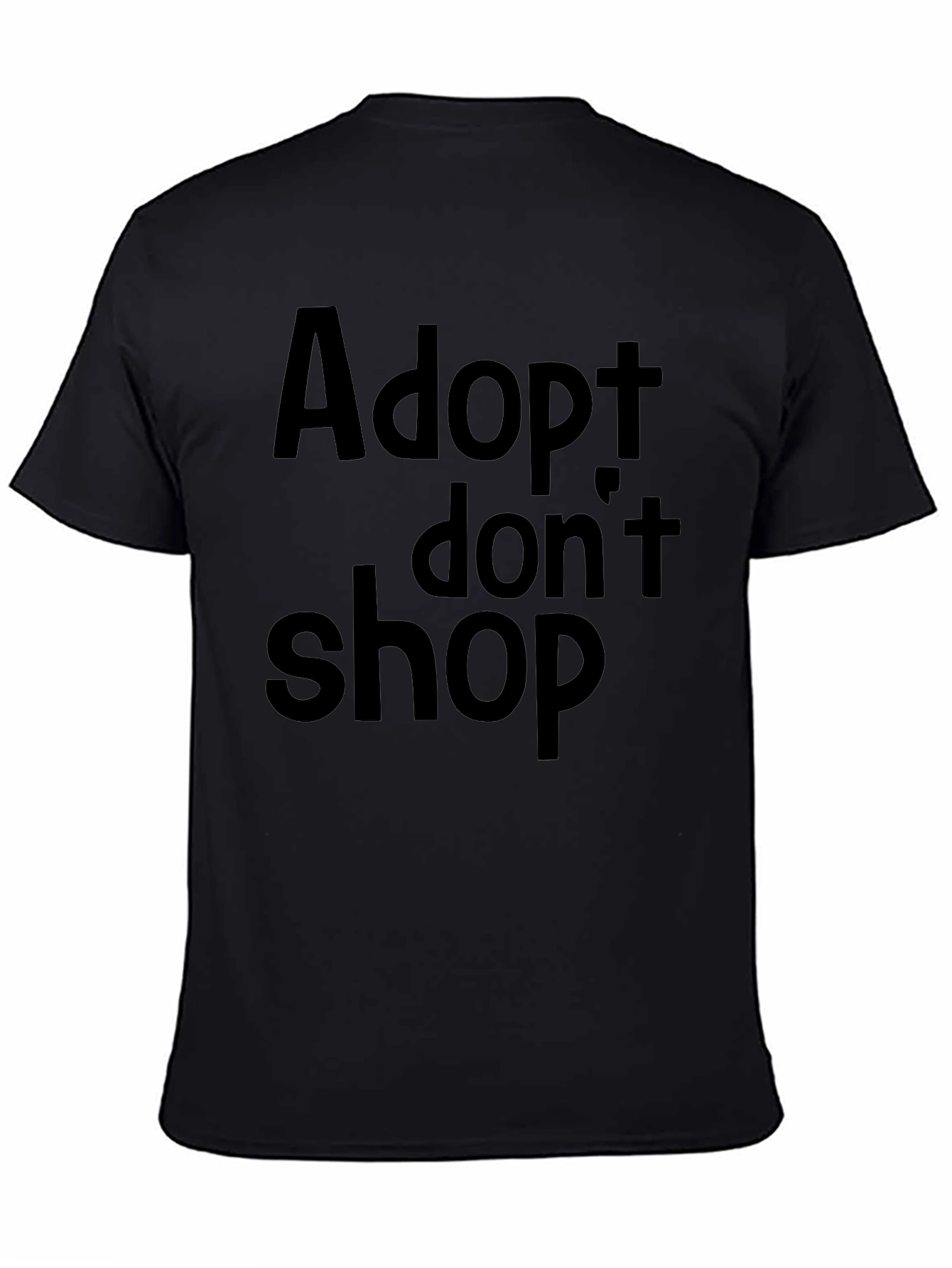 Show your support for animal adoption with this stylish black t-shirt. The shirt features a bold "Adopt don't shop" message printed across the chest. Made from a comfortable, breathable fabric, this tee is perfect for everyday wear. It's a great way to raise awareness and start conversations about responsible pet ownership. Whether you're volunteering at a shelter, running errands, or just relaxing at home, this shirt lets you wear your values with pride. Available in various sizes, this tee makes a thoughtful gift for any animal lover. Get yours today and spread the word!