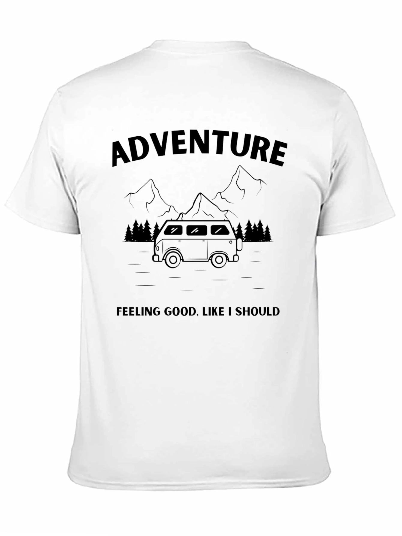Embrace your love for adventure with this classic black graphic t-shirt. Made from comfortable, breathable fabric, this tee features a stylish design of a vintage van nestled amidst mountains and trees, with the word "ADVENTURE" boldly printed above. Below the graphic, the phrase "FEELING GOOD. LIKE I SHOULD" adds a touch of positivity. Perfect for casual outings, road trips, or simply relaxing at home, this t-shirt effortlessly combines comfort and style. Show off your wanderlust spirit with this unique and eye-catching piece. A great gift for travel enthusiasts and nature lovers alike.