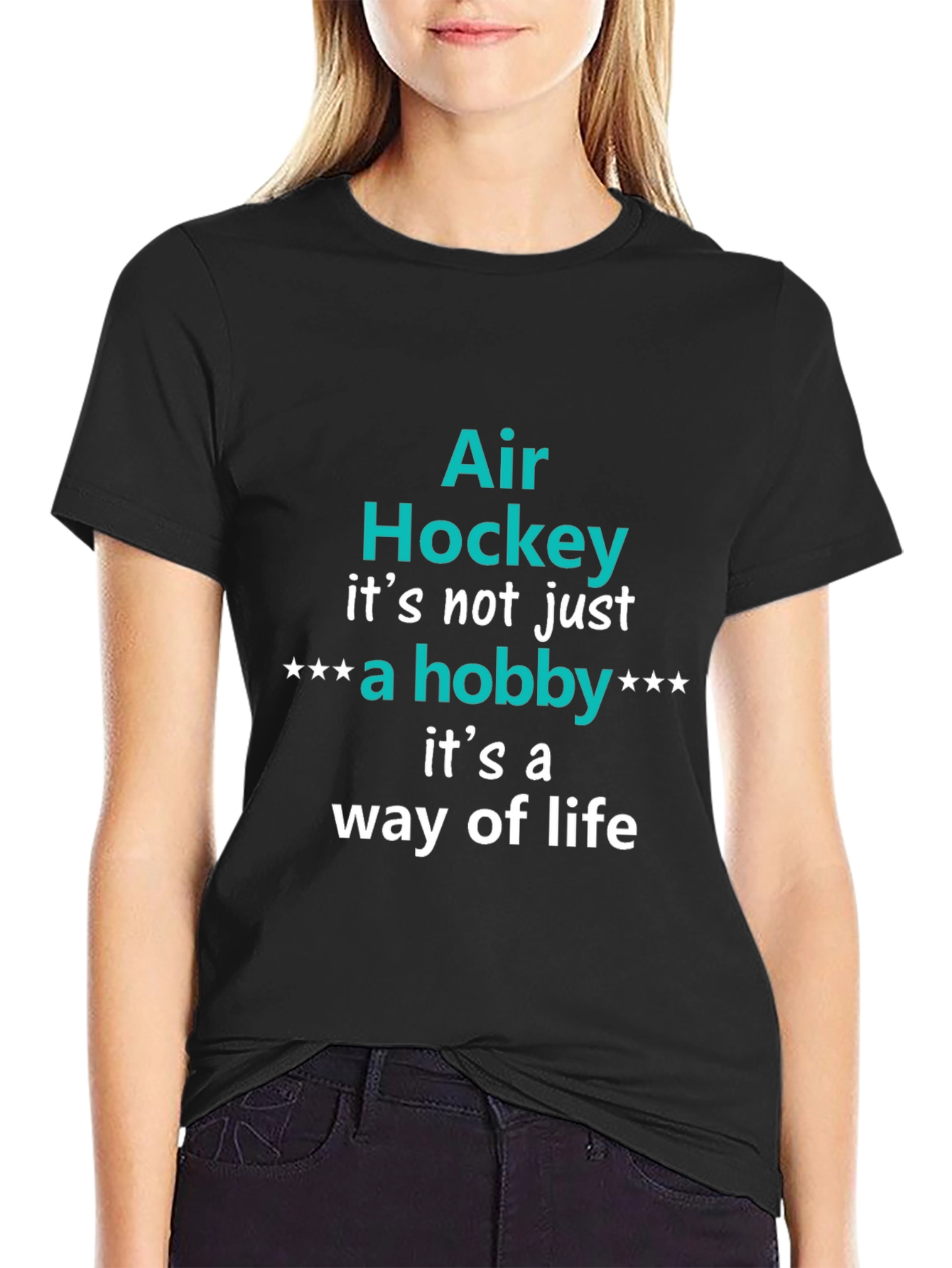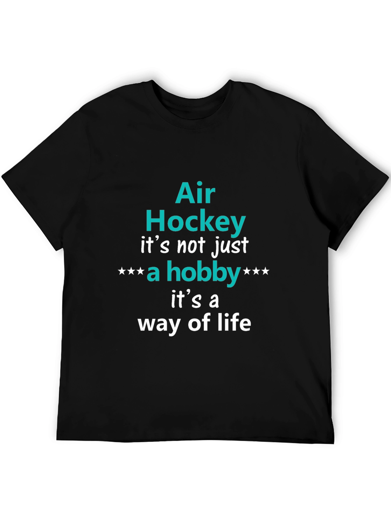 Show your love for air hockey with this stylish black T-shirt. The design features the words "Air Hockey" in a vibrant teal color, followed by the phrase "it's not just a hobby" and "it's a way of life" in white lettering. The shirt appears to be made from a soft, comfortable cotton blend, making it perfect for casual wear or a friendly game. The bold graphic is sure to turn heads, making it a great conversation starter for fellow air hockey enthusiasts. Ideal for casual outings, game nights, or simply expressing your passion for this exciting sport.