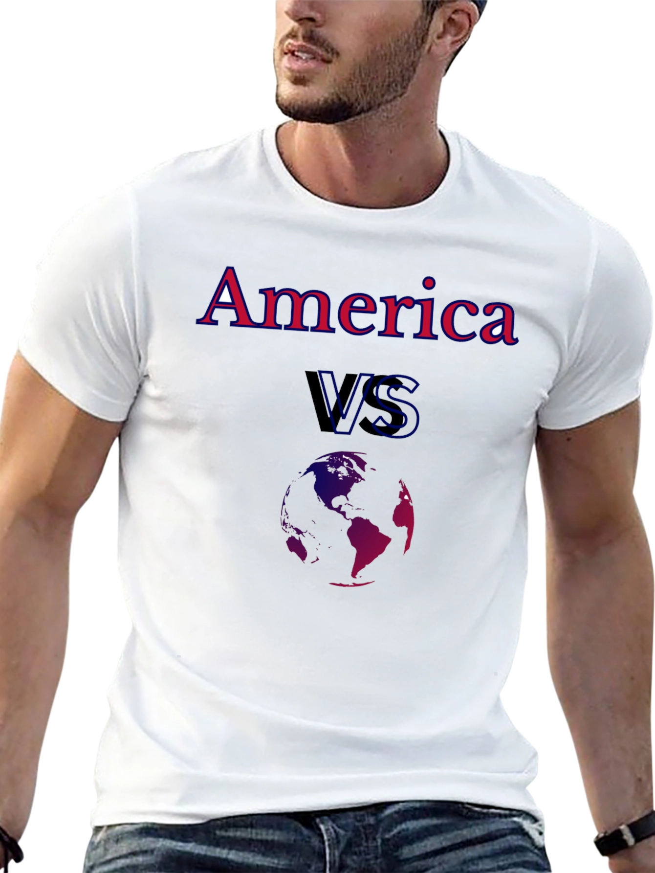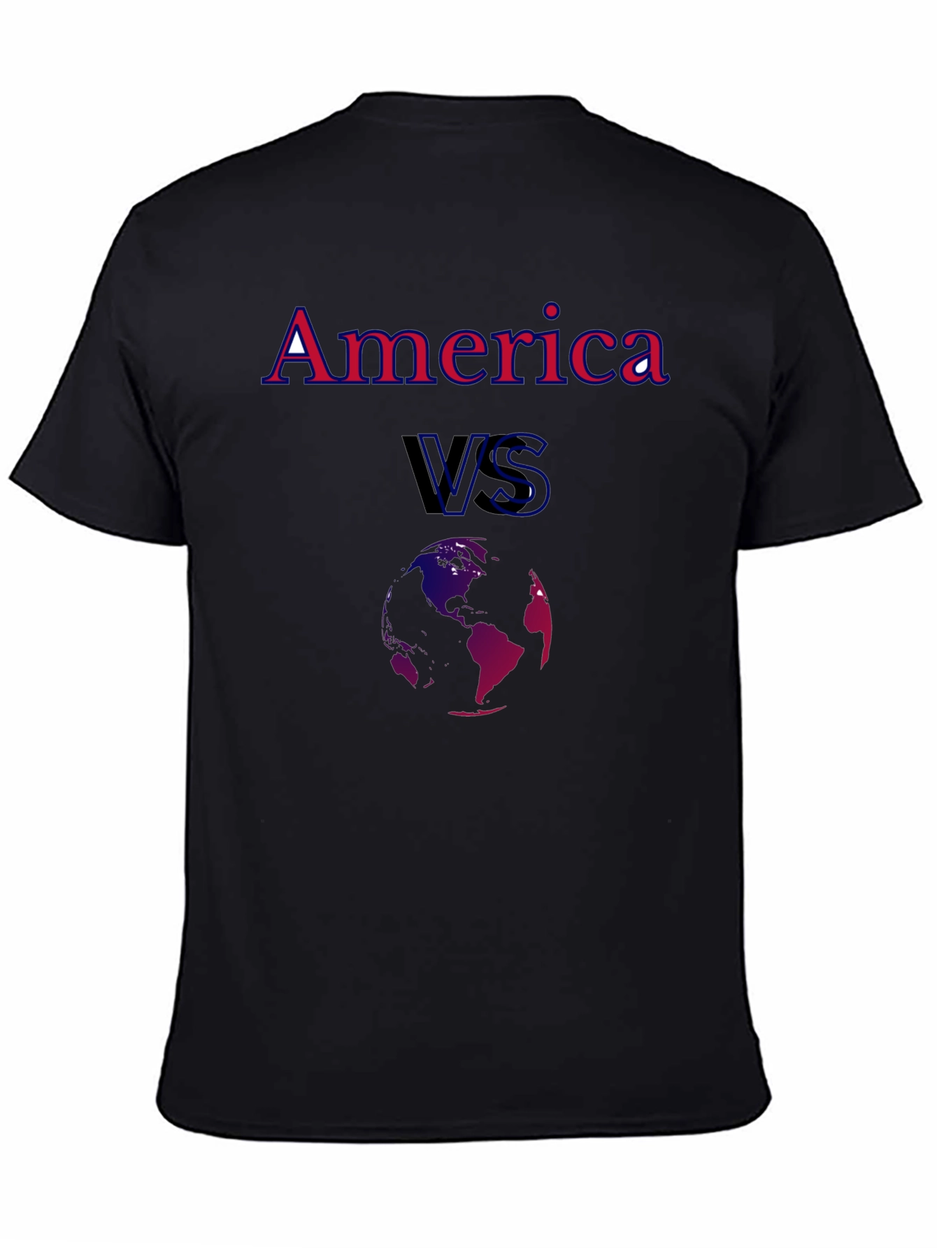 Show your unique style with this 'America VS' graphic t-shirt. Made from a soft, comfortable fabric, this black tee features a bold graphic print of the word 'America' above 'VS', above a world design, all presented in a striking color scheme. The classic crew neck and short sleeve design makes it perfect for casual wear. Whether you're expressing your point of view, or just want a conversation starter, this t-shirt is sure to turn heads. Pair it with jeans, shorts, or your favorite joggers for a complete and stylish look.