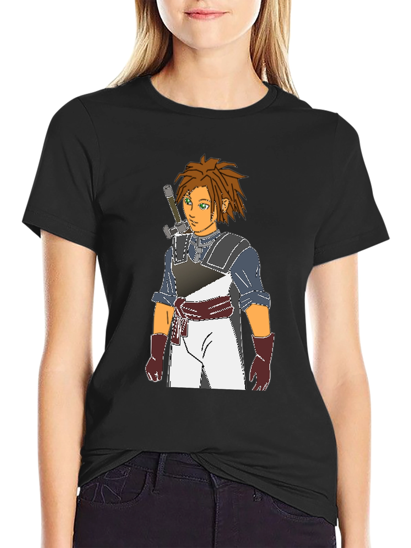 Show off your love for anime with this unique black t-shirt. Featuring a vibrant graphic of a male anime character with brown hair, green eyes, and a sword slung over his shoulder. The character is wearing a detailed outfit, including what appears to be a blue shirt, white pants, brown gloves and armor, all adding to the shirt's appeal. Made from comfortable material, this shirt is perfect for casual wear, conventions, or as a gift for the anime enthusiast in your life. Make a statement with this one-of-a-kind graphic tee!