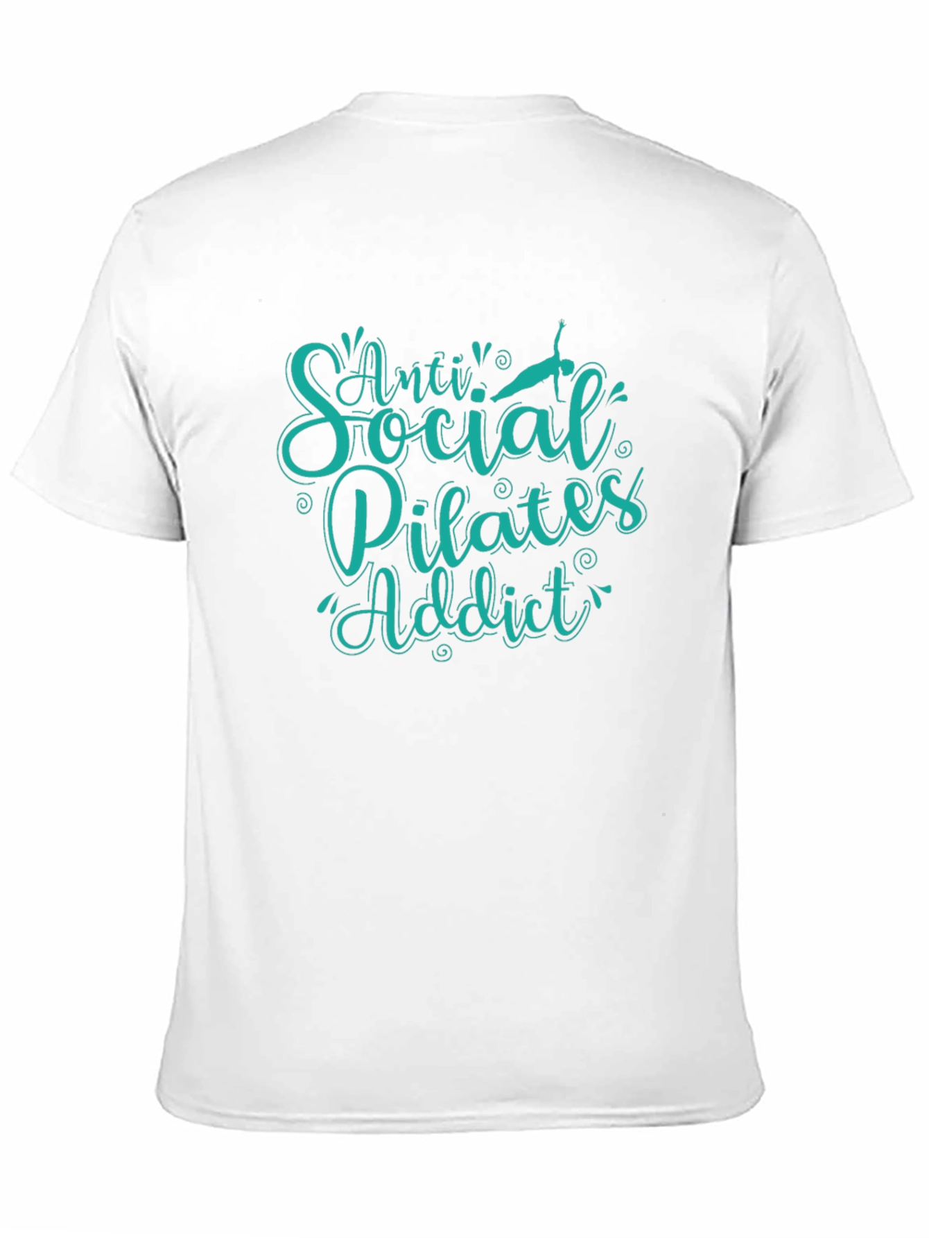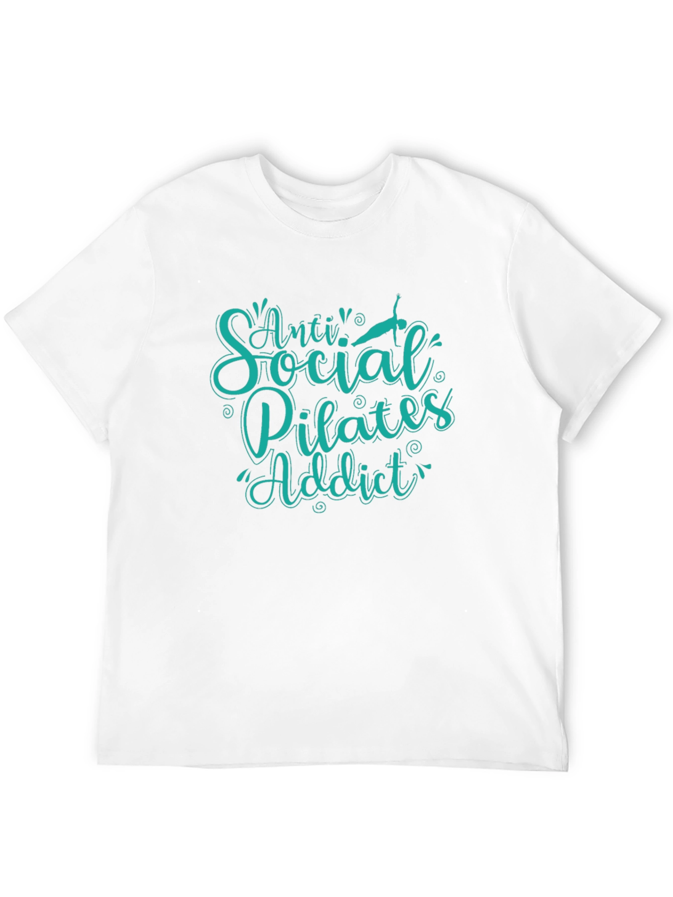 This stylish black t-shirt features a playful design for Pilates enthusiasts. The turquoise text reads "Anti Social Pilates Addict" in a whimsical, decorative font, making it a fun statement piece. Crafted from a comfortable-looking fabric, this short-sleeve tee is perfect for wearing to your Pilates class, the gym, or for casual everyday wear. Show off your passion for Pilates with this unique and eye-catching t-shirt. It also makes a great gift for the Pilates lover in your life!