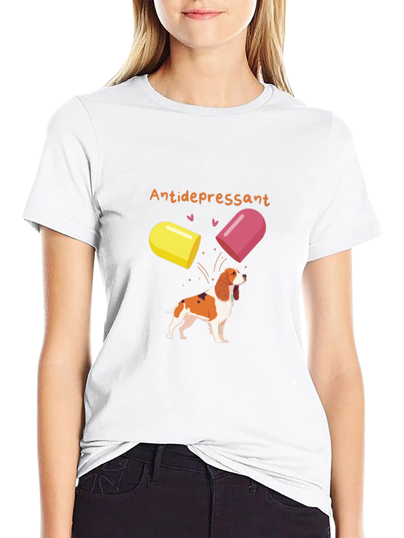 This unique black t-shirt features a whimsical design showcasing a happy dog seemingly 'prescribed' antidepressants in the form of colorful pills. The graphic design is printed on the center of the shirt. It is comfortable and stylish for casual wear. The image is eye-catching and fun! Show off your love for dogs and a great sense of humor with this standout piece.