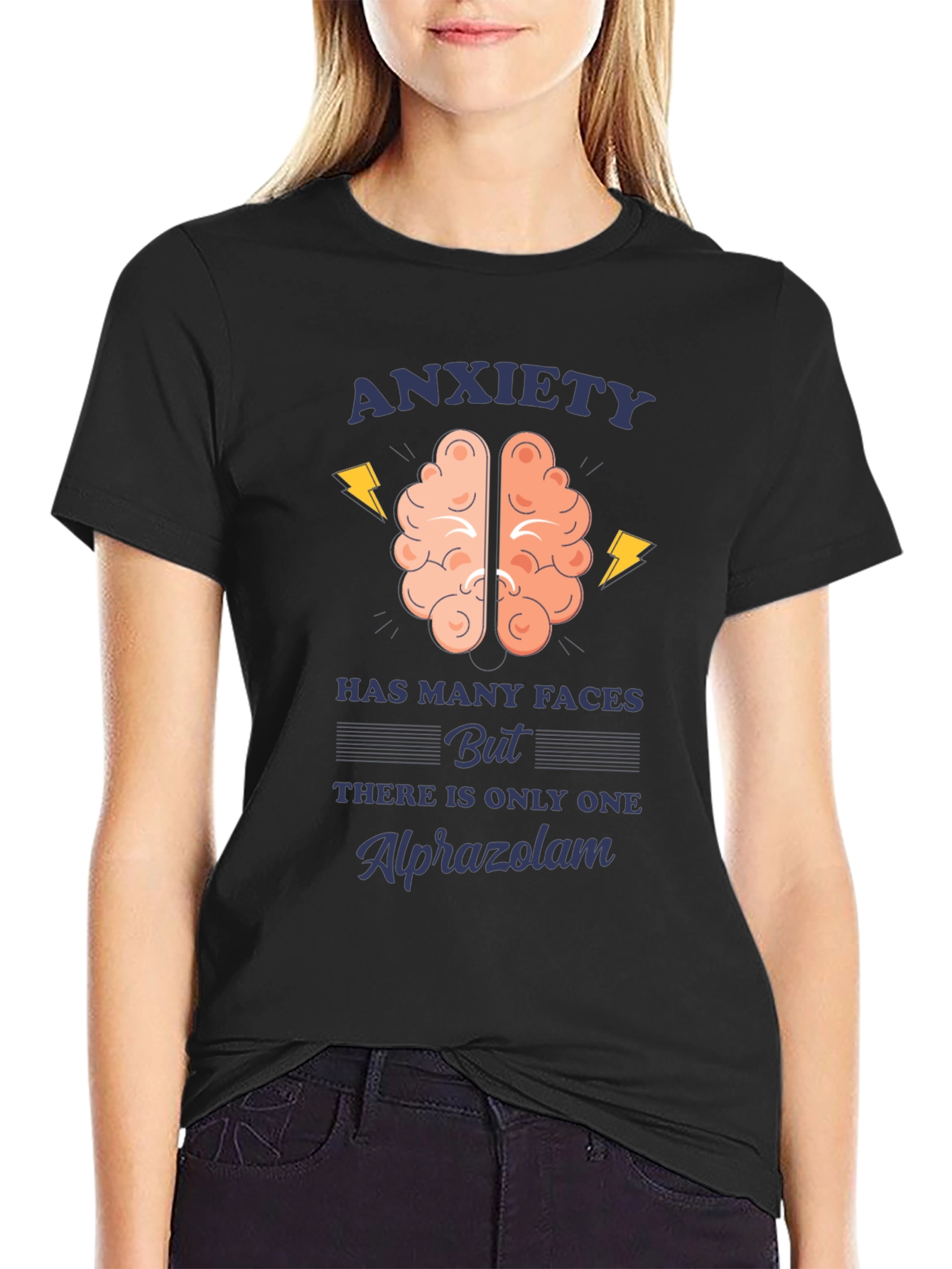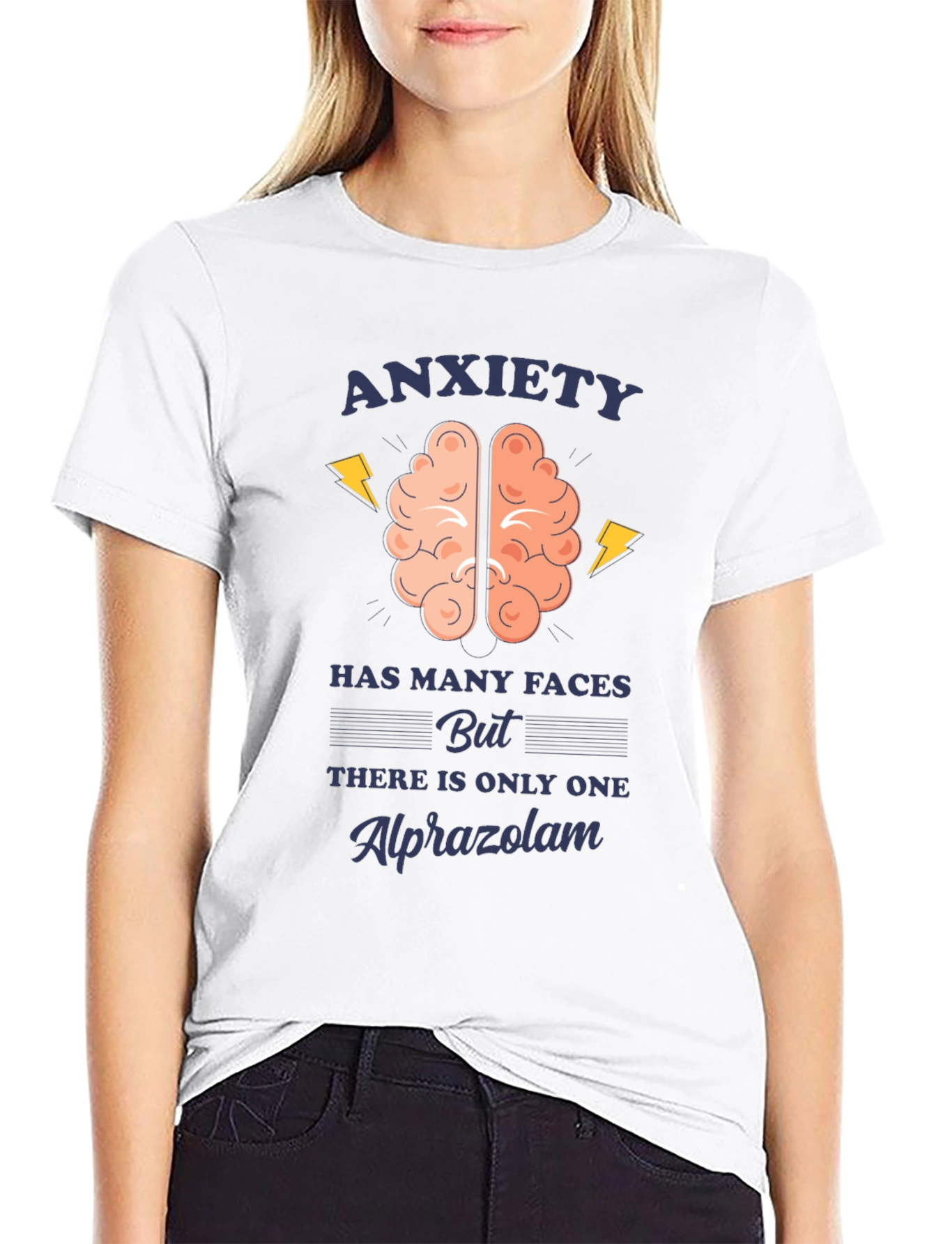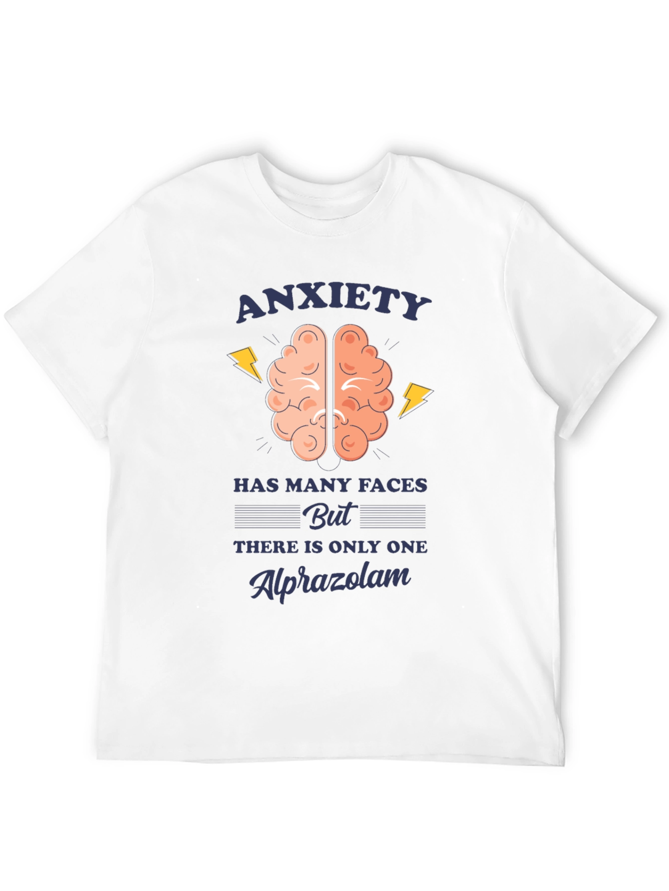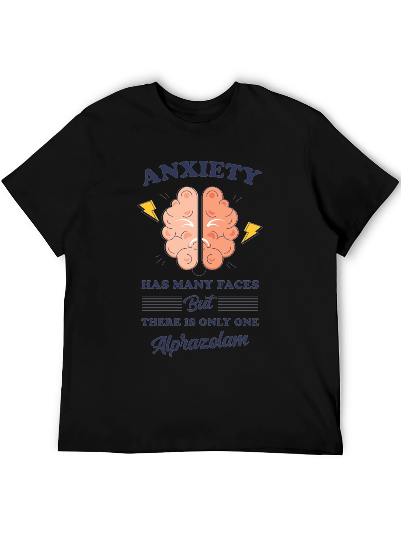 Show your feelings with this unique graphic t-shirt. The design features a stylized brain illustration with the text "ANXIETY HAS MANY FACES But THERE IS ONLY ONE Alprazolam". This short-sleeve tee is made from a soft, comfortable fabric, perfect for everyday wear. The bold graphic print adds a touch of edgy humor and is sure to spark conversations. This is an ideal gift for friends, family, or anyone who appreciates novelty apparel with a message. Pair it with jeans, shorts, or your favorite casual bottoms for a relaxed, stylish look. Express yourself with this statement piece!