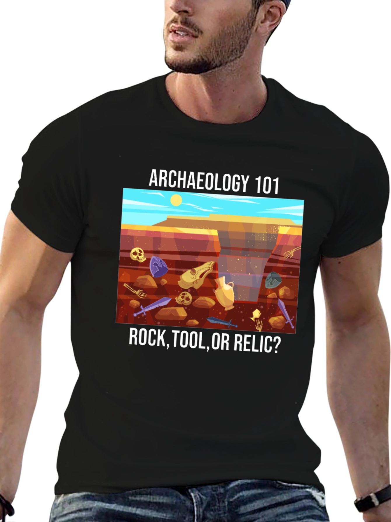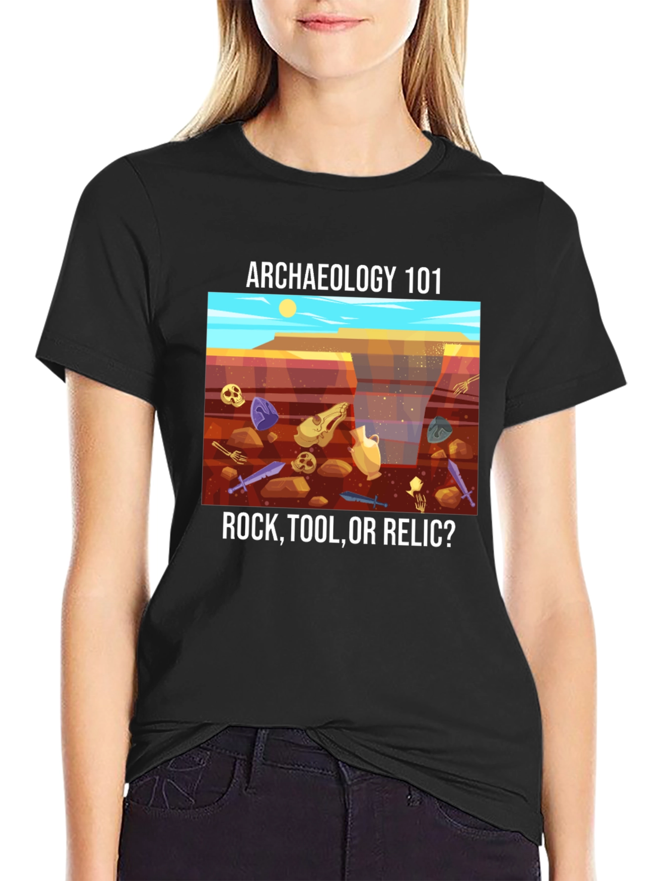 Unearth your passion for history with this unique Archaeology 101 T-shirt. The design features a colorful cartoon desert scene, scattered with ancient artifacts like skulls, pottery, and swords. Above, the words "Archaeology 101" invite curiosity, while below, the question "Rock, Tool, or Relic?" challenges your knowledge. This tee is perfect for archaeologists, history buffs, or anyone fascinated by the past. Wear it on digs, to lectures, or simply as a conversation starter. Express your love for the past with this comfortable and eye-catching tee.