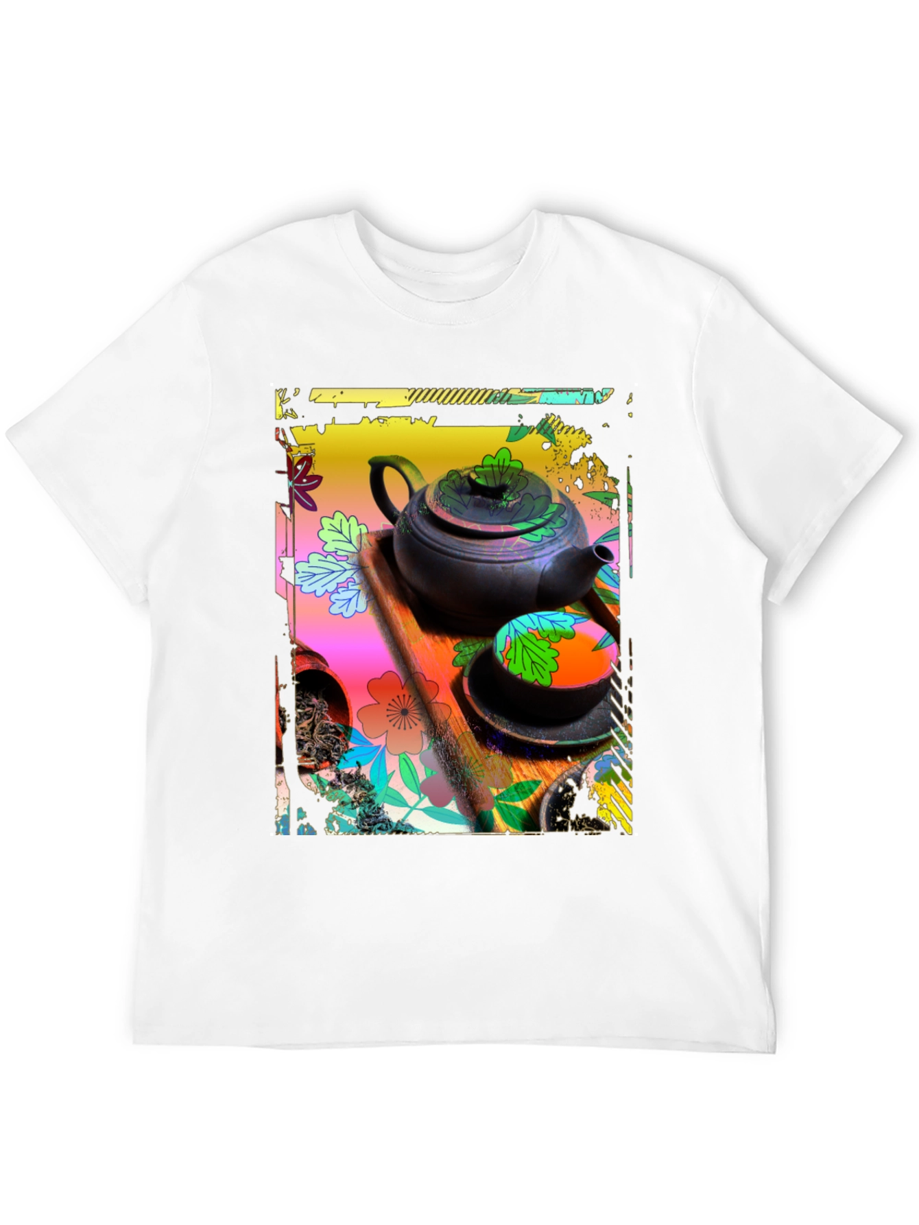 Elevate your casual style with this unique graphic tee! This black t-shirt features a vibrant and artistic print of a tea set. The design includes a teapot, teacups, and a decorative floral background in a range of eye-catching colors, making it a standout piece. Perfect for tea lovers and art enthusiasts alike, this tee adds a touch of creativity to any outfit. Made from comfortable, breathable fabric, it's ideal for everyday wear. Pair it with jeans or shorts for a relaxed yet stylish look. This graphic tee is sure to spark conversations and showcase your individual flair.