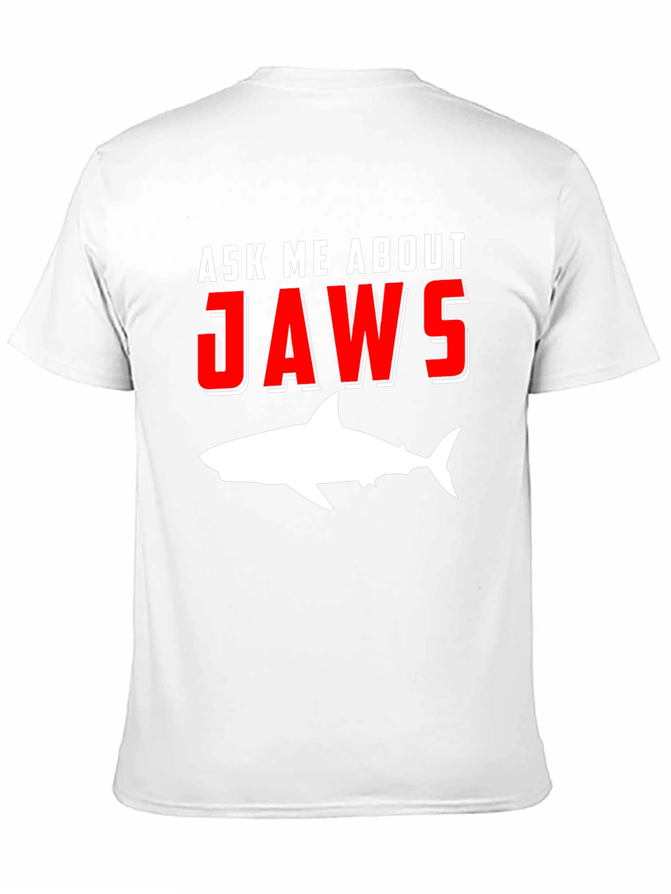 Dive into conversation with this bold "Ask Me About Jaws" t-shirt! Made from comfortable black fabric, this tee features eye-catching red and white lettering above a silhouette of a great white shark. Show off your love for the classic shark movie and spark interesting discussions. Perfect for movie nights, beach trips, or casual wear, this shirt is a must-have for any Jaws enthusiast. The unique design is sure to make a splash wherever you go. Get yours today and become an instant conversation starter!