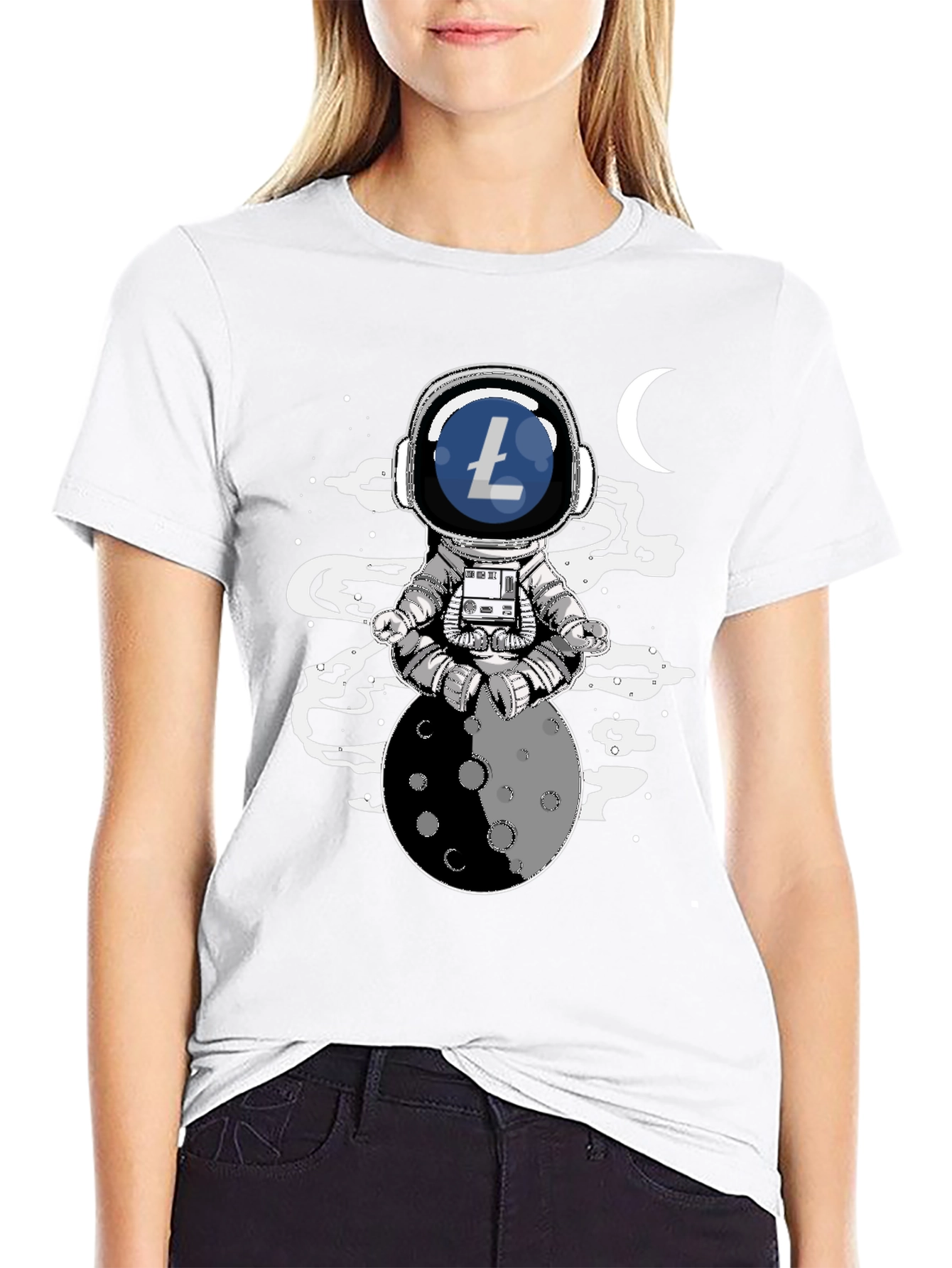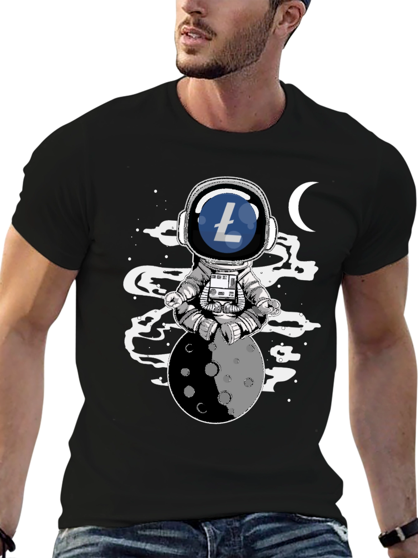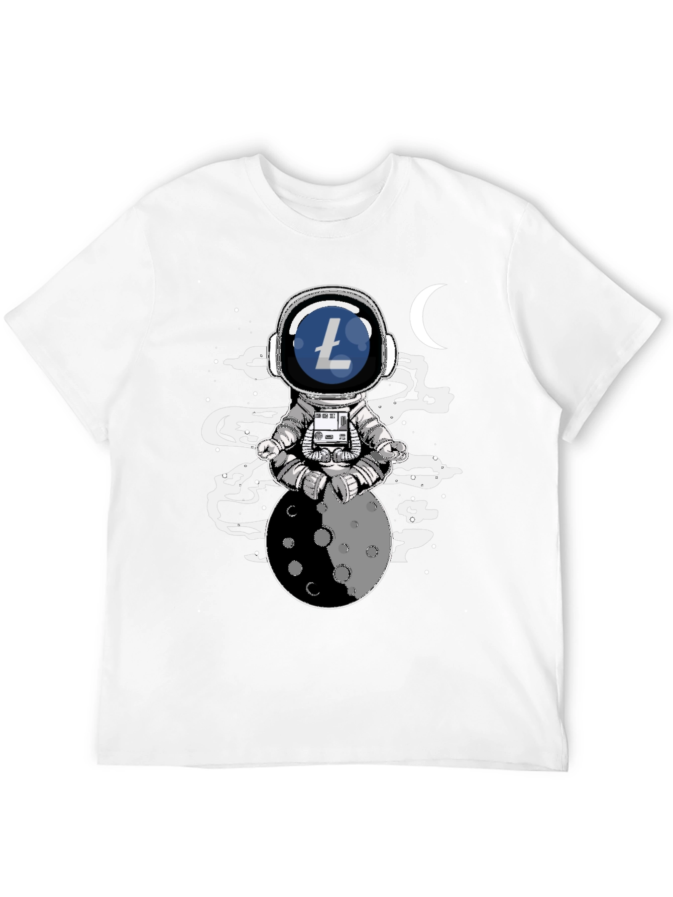 Reach for the moon with this Astronaut Litecoin T-shirt! The tee features a unique design of an astronaut sitting atop a moon in a meditative pose with a Litecoin logo emblazoned on his helmet. The shirt is crafted from a soft, breathable fabric ensuring all-day comfort. This t-shirt is perfect for those who love cryptocurrencies and space exploration. Express your interest in digital currencies while showcasing a stylish, unique design. Ideal for casual outings, crypto meetups, or just lounging at home, this T-shirt is a must-have for any Litecoin enthusiast.