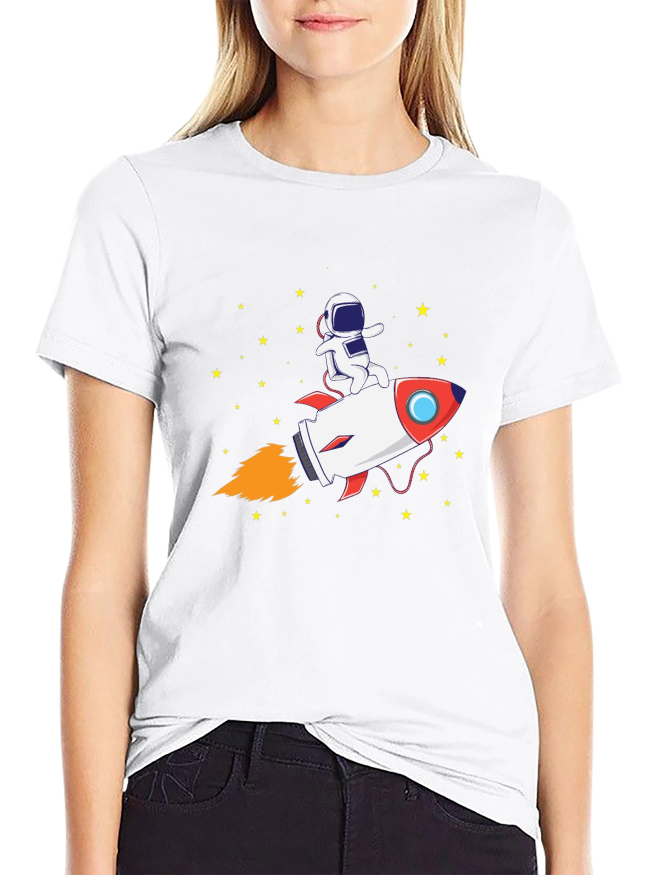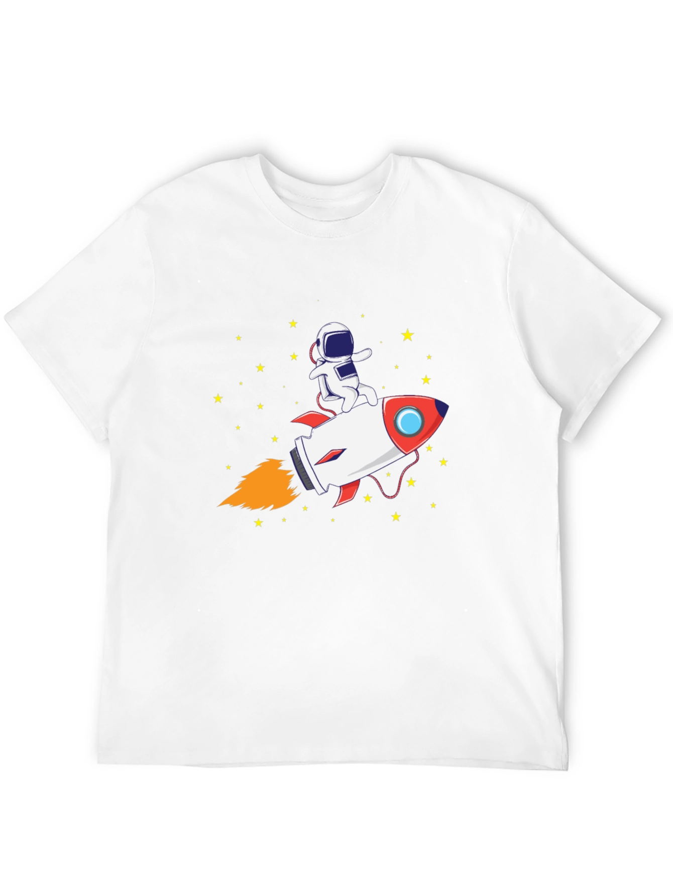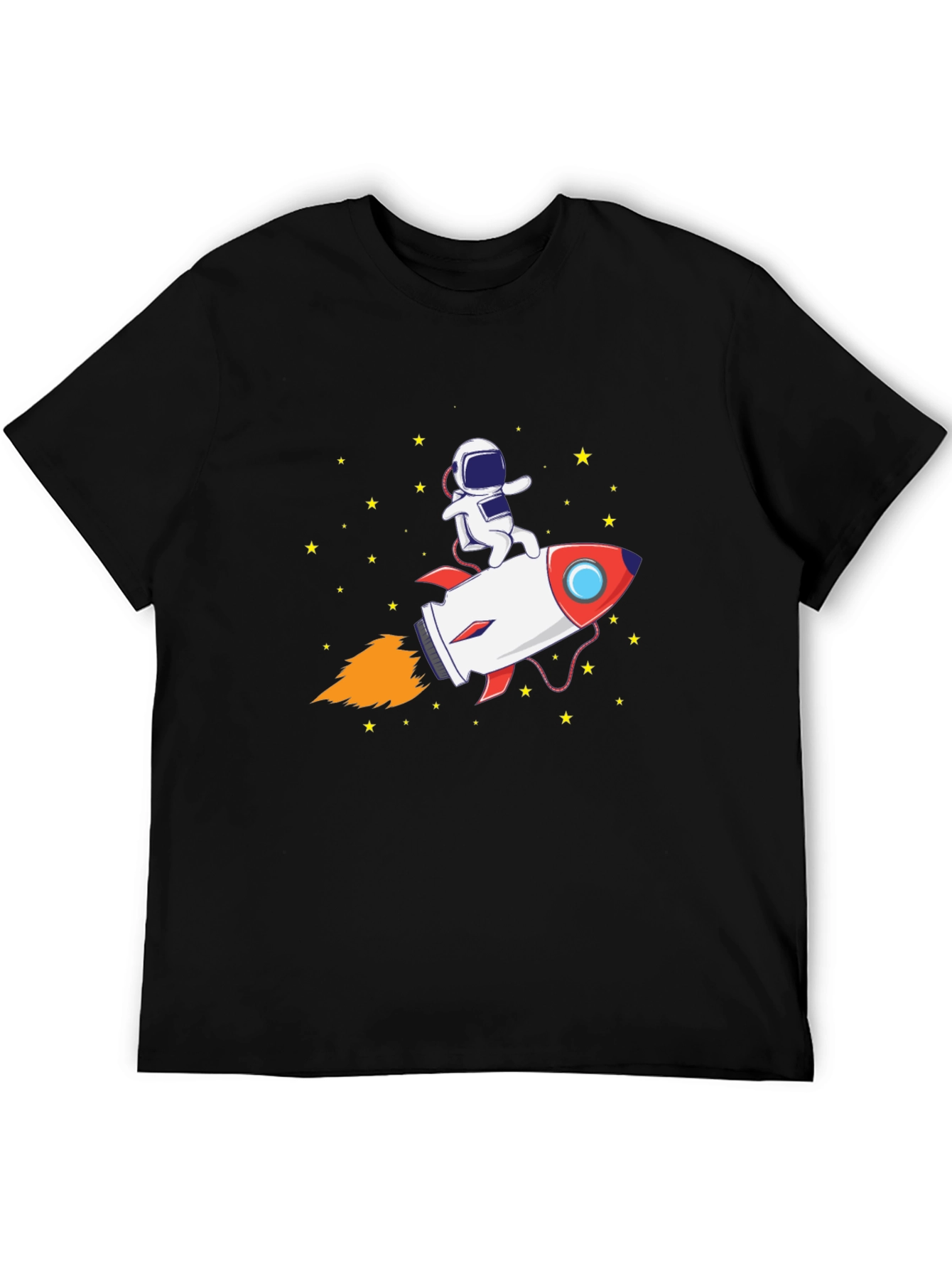 Blast off in style with this eye-catching black t-shirt featuring a fun, cartoon-style graphic. An astronaut rides a red and white rocket, surrounded by stars, creating a playful space-themed design. This short-sleeved tee is made from what appears to be a soft, comfortable material, perfect for everyday wear. The vibrant graphic adds a touch of whimsy to your wardrobe, making it an ideal choice for casual outings, weekend adventures, or simply lounging at home. Show off your love for space exploration with this unique and stylish t-shirt!