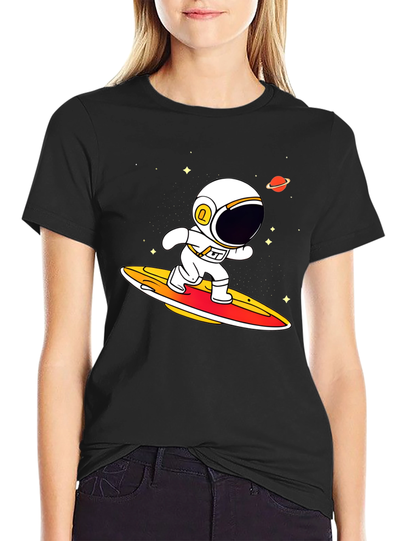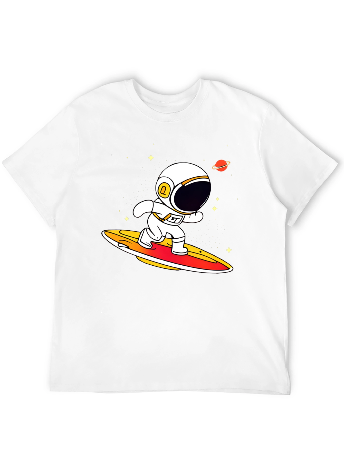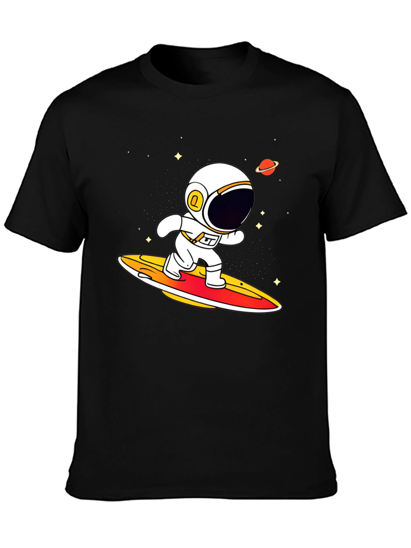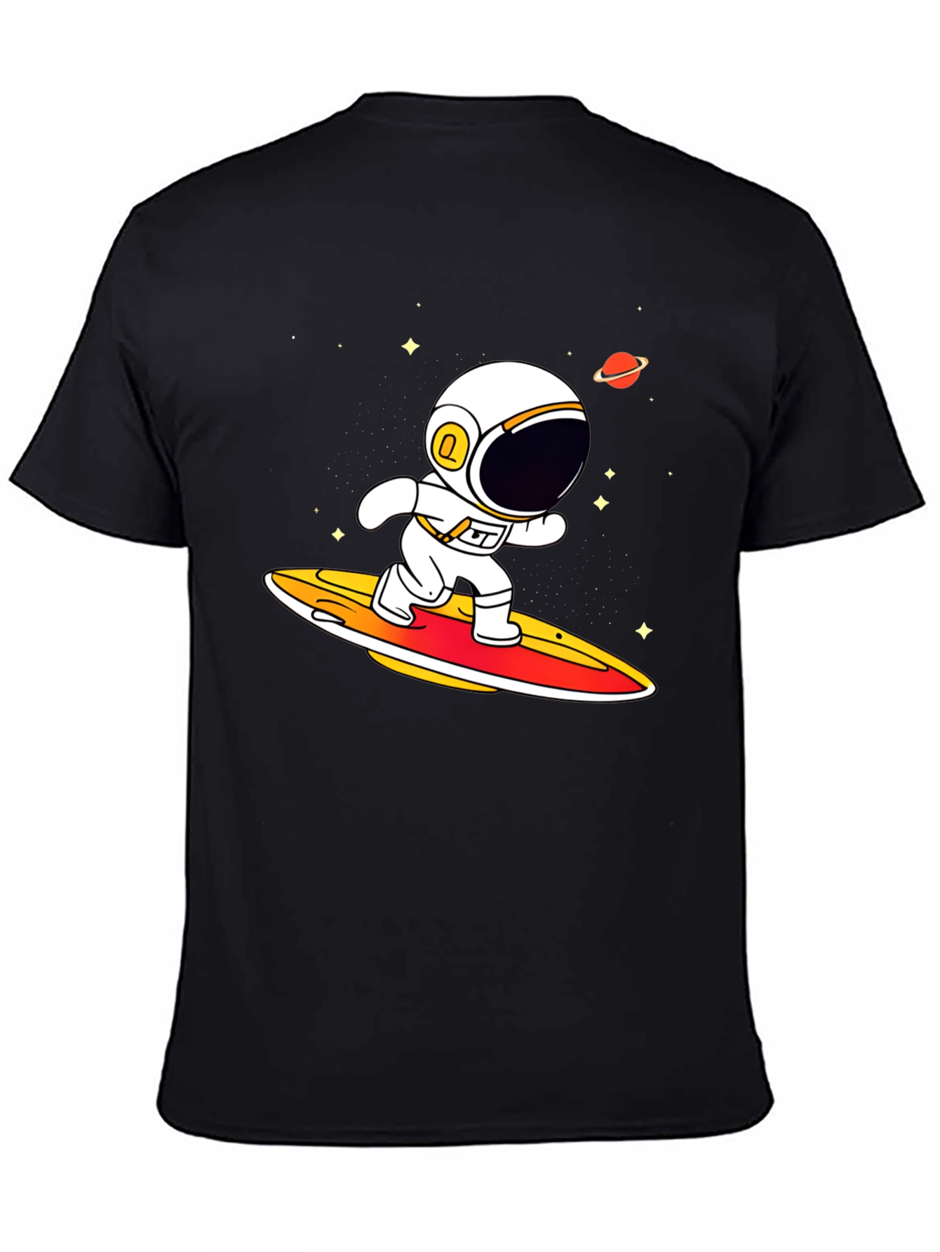 Blast off in style with this unique astronaut surfing t-shirt! This black tee features a vibrant graphic of a cartoon astronaut riding a surfboard through space, complete with stars and a planet. The design is eye-catching and fun, perfect for anyone who loves space, surfing, or quirky apparel. Made from what appears to be a comfortable, breathable fabric, this shirt is ideal for everyday wear, casual outings, or showing off your interests. Stand out from the crowd and let your style take flight with this conversation-starting piece!