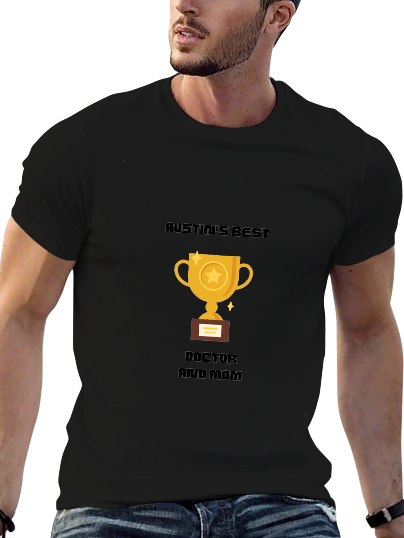 Show your appreciation with this unique black t-shirt. The design features a gold trophy with a star emblem, proudly declaring "Austin's Best Doctor and Mom." Made from a comfortable-looking fabric, this tee is perfect for casual wear. Whether you're running errands, relaxing at home, or want to make a statement, this t-shirt is the right choice. Gift this t-shirt to that special Doctor and Mom for recognition or any special occasion. A great way to celebrate the best.