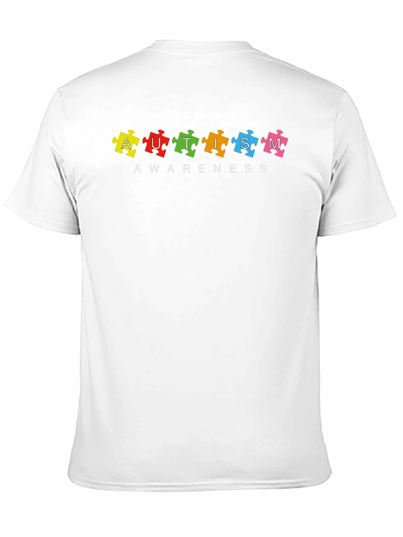 Show your support with this Autism Awareness T-shirt. The shirt features a playful row of colorful puzzle pieces, each representing a letter of the word "AUTISM," followed by the word "AWARENESS" in a clean, simple font. This visually appealing design effectively conveys a message of support and understanding. Made from what appears to be a soft, comfortable fabric, it's perfect for everyday wear, autism awareness events, or as a thoughtful gift. Wear it with pride and help spread awareness for autism acceptance and inclusion.