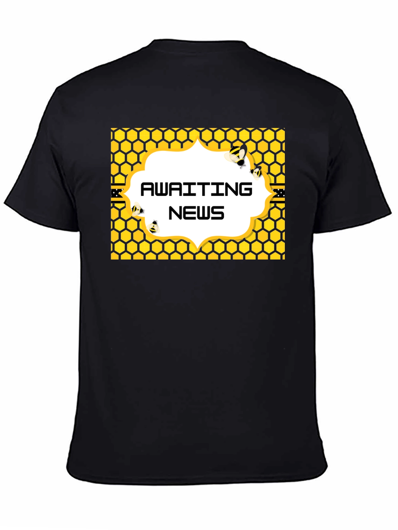 This eye-catching black t-shirt features a unique design. The central graphic showcases the text "Awaiting News" in a stylish font, set against a cloud-like shape with a honeycomb background with bees. This comfortable and casual tee is perfect for everyday wear, whether you're running errands, hanging out with friends, or just relaxing at home. Show off your love for bees and your quirky side with this statement piece. It's sure to spark conversation!