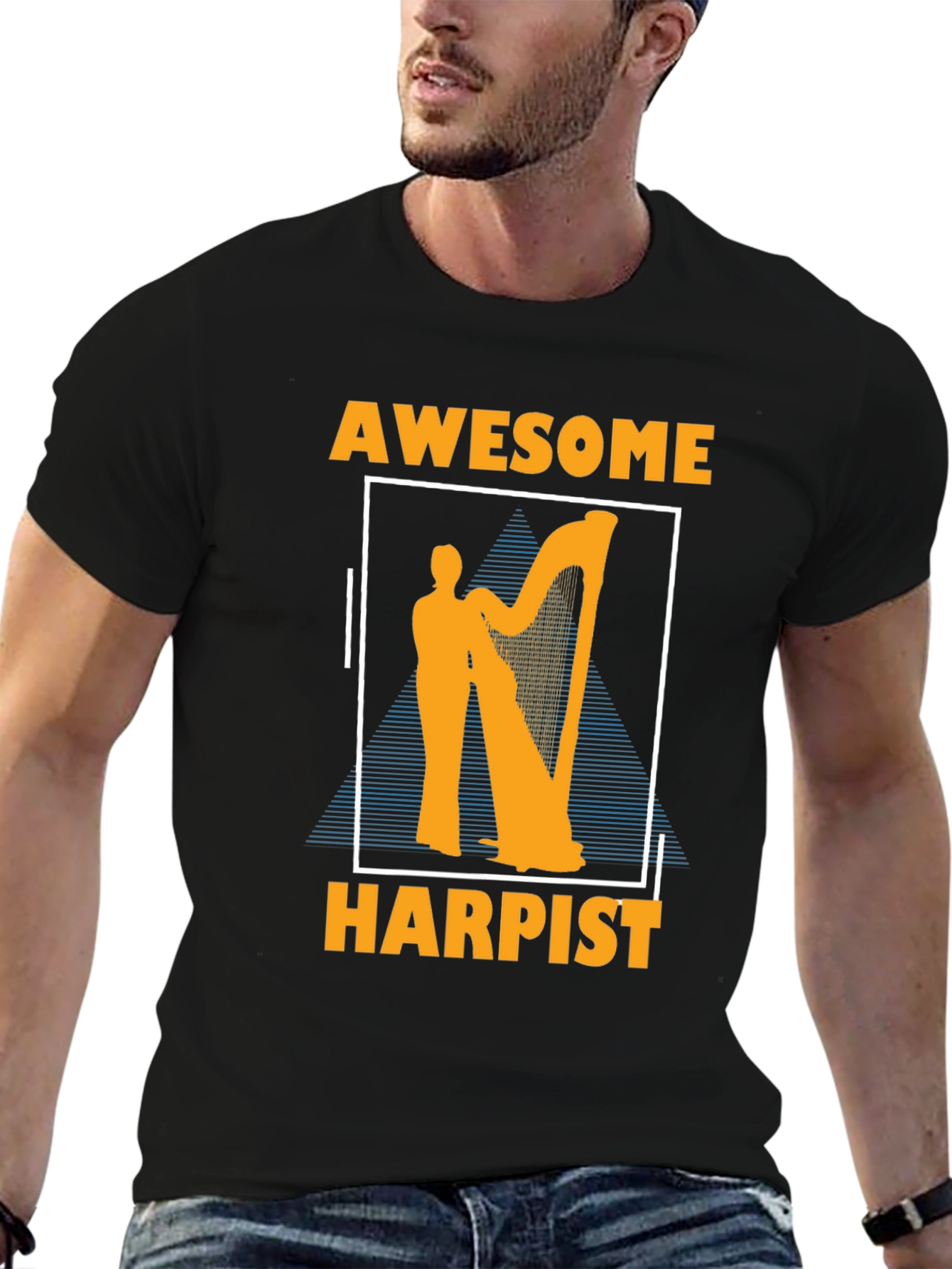 Show off your love for the harp with this stylish graphic t-shirt. This black tee features the words "AWESOME HARPIST" printed above and below a graphic of a harpist and their instrument, set within a square. The design's color scheme features eye-catching orange hues. Made from soft, breathable fabric, this shirt is perfect for everyday wear or for music events. It���s a great way to express your passion for music and makes a thoughtful gift for harpists and music lovers alike. Wear it proudly to concerts, rehearsals, or casual outings. Get yours today and let your love for the harp shine!