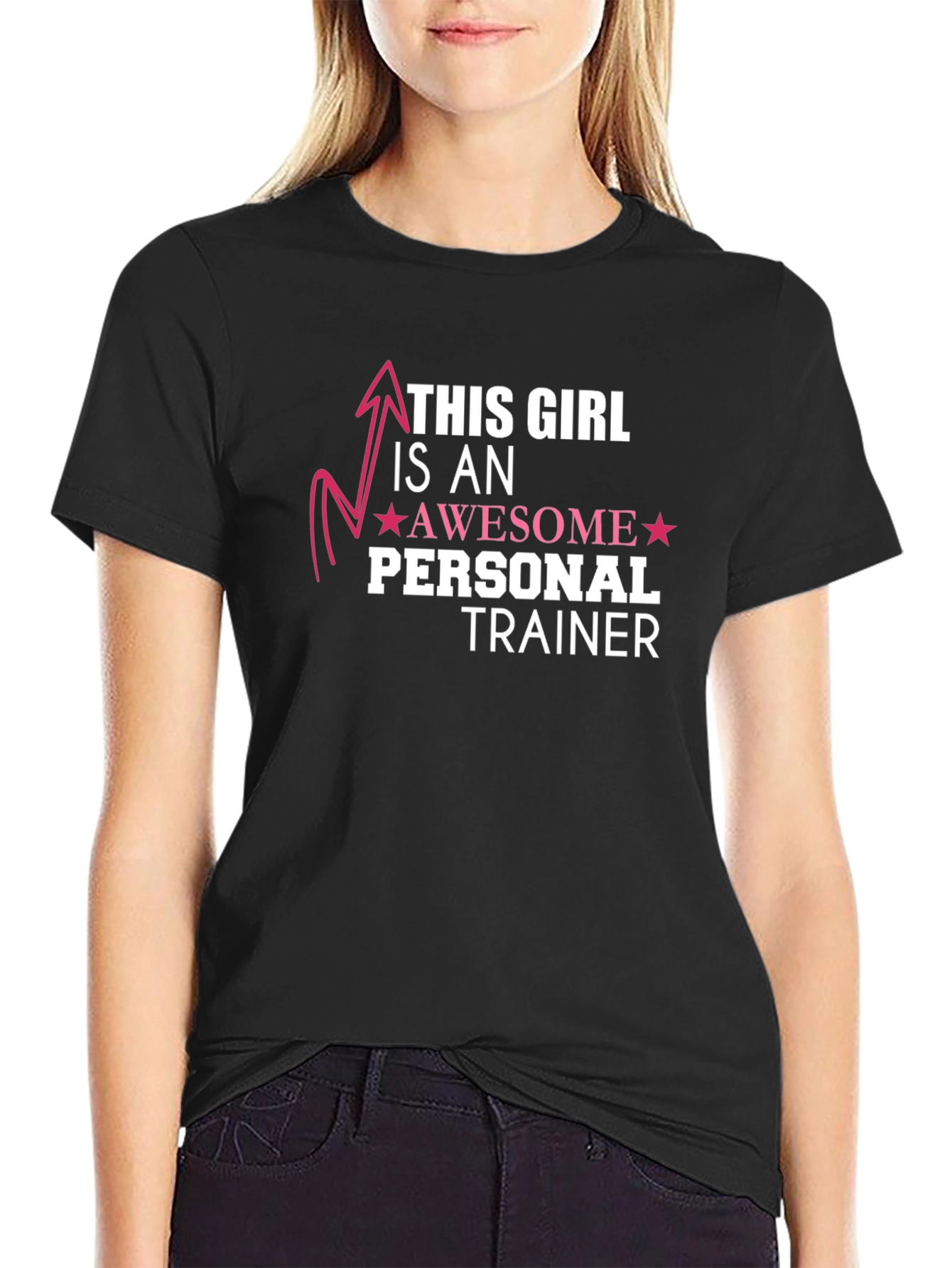 This stylish black t-shirt features a bold graphic print, perfect for personal trainers. The design incorporates the text "This Girl is an AWESOME Personal Trainer" in a modern font, complete with star accents and a stylized arrow. Made from comfortable, breathable fabric, this shirt is ideal for workouts, casual wear, or promoting your fitness business. Show off your passion and expertise with this unique and eye-catching tee. A great gift for any dedicated female personal trainer! Let everyone know you are an awesome trainer with style and confidence.