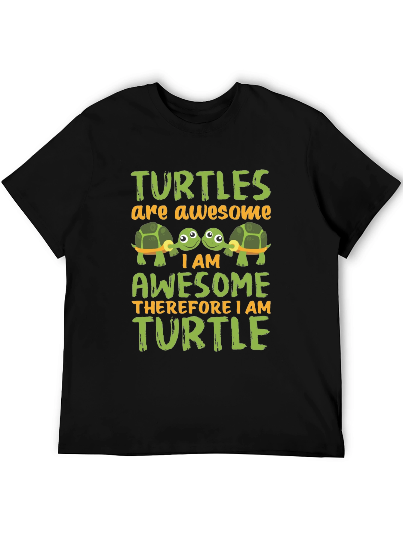 Show your love for turtles with this eye-catching black graphic tee! The design features a vibrant, playful print with the phrase "TURTLES are awesome I AM AWESOME THEREFORE I AM TURTLE", accompanied by adorable cartoon turtle illustrations. The design uses shades of green and orange. Made from a comfortable-looking fabric, this short-sleeved shirt is perfect for casual wear, trips to the zoo, or any turtle-themed event. It's a fun and expressive way to show off your personality and passion for these amazing creatures. Get yours today and let the world know you're an awesome turtle enthusiast!
