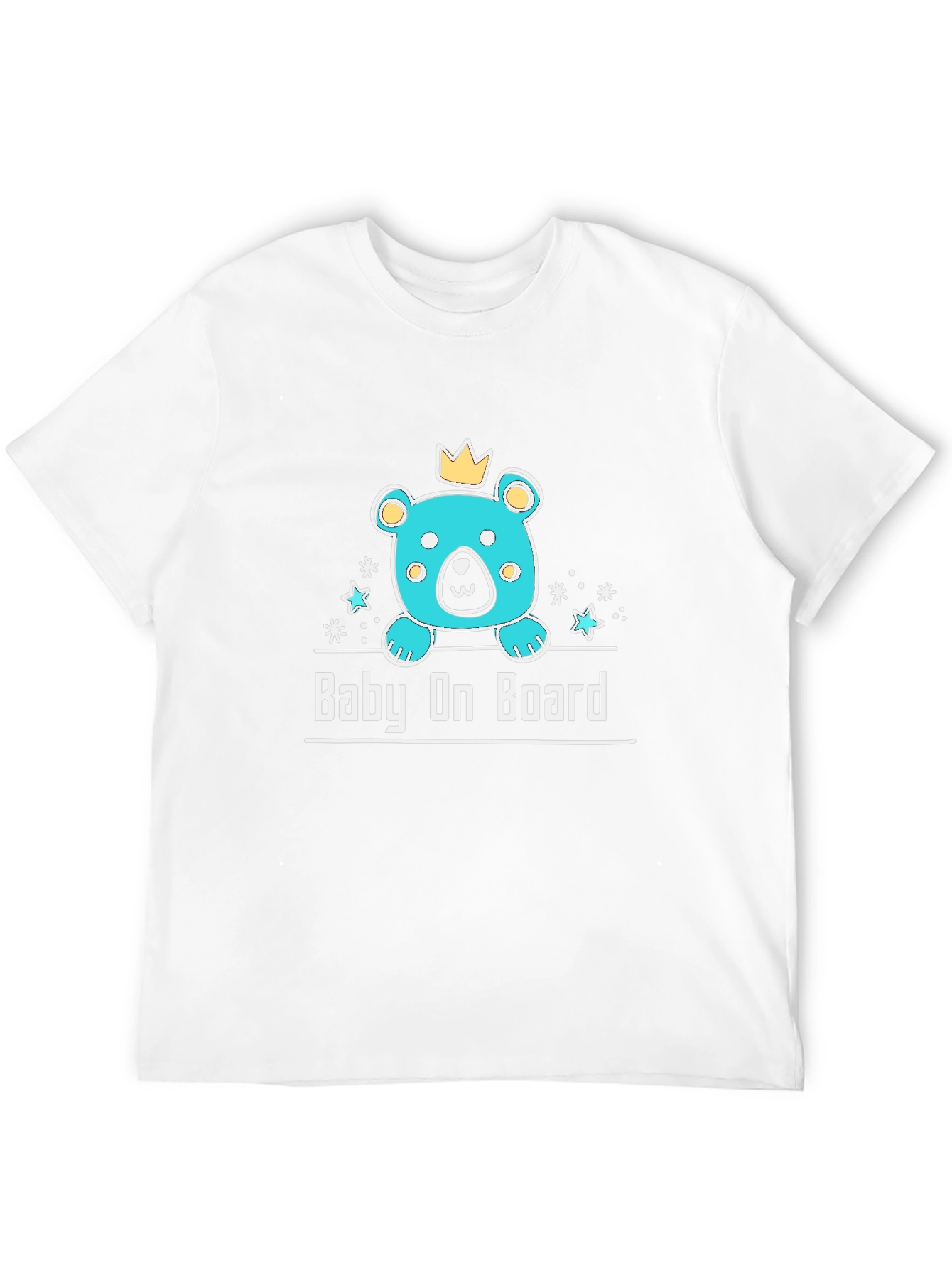 A charming black t-shirt featuring a delightful "Baby On Board" design. This eye-catching shirt showcases a cute, cartoon-style light blue bear wearing a golden crown, surrounded by decorative stars and sparkles. The whimsical graphic is perfect for expecting parents or those who want to announce their little one's arrival in a fun and unique way. Made from a comfortable material, this t-shirt is ideal for everyday wear. Its playful design makes it a great conversation starter and a sweet addition to any wardrobe. Get ready to show off your excitement with this adorable bear tee!