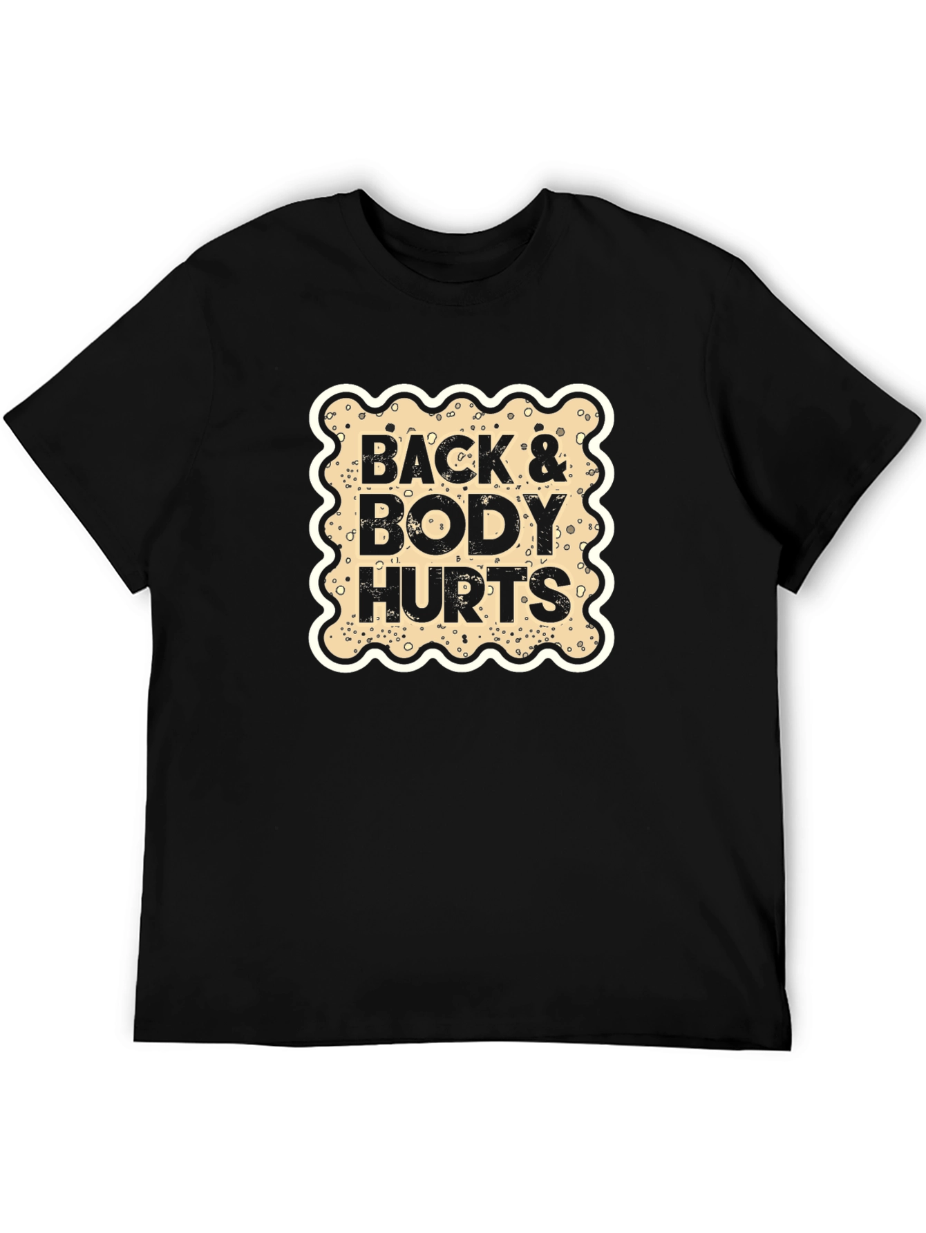 This classic black t-shirt features a unique and humorous graphic print. The design showcases the phrase "Back & Body Hurts" encased within a stylized border. The shirt is likely made of a comfortable, breathable cotton blend. The graphic's eye-catching design makes it a great conversation starter. Ideal for casual wear, workouts, or a fun gift for someone who appreciates a good laugh. Show off your sense of humor and wear it with pride!