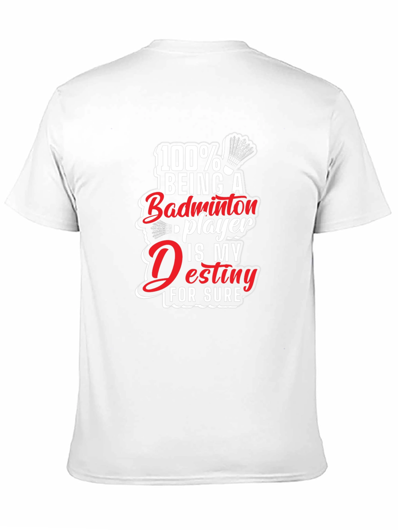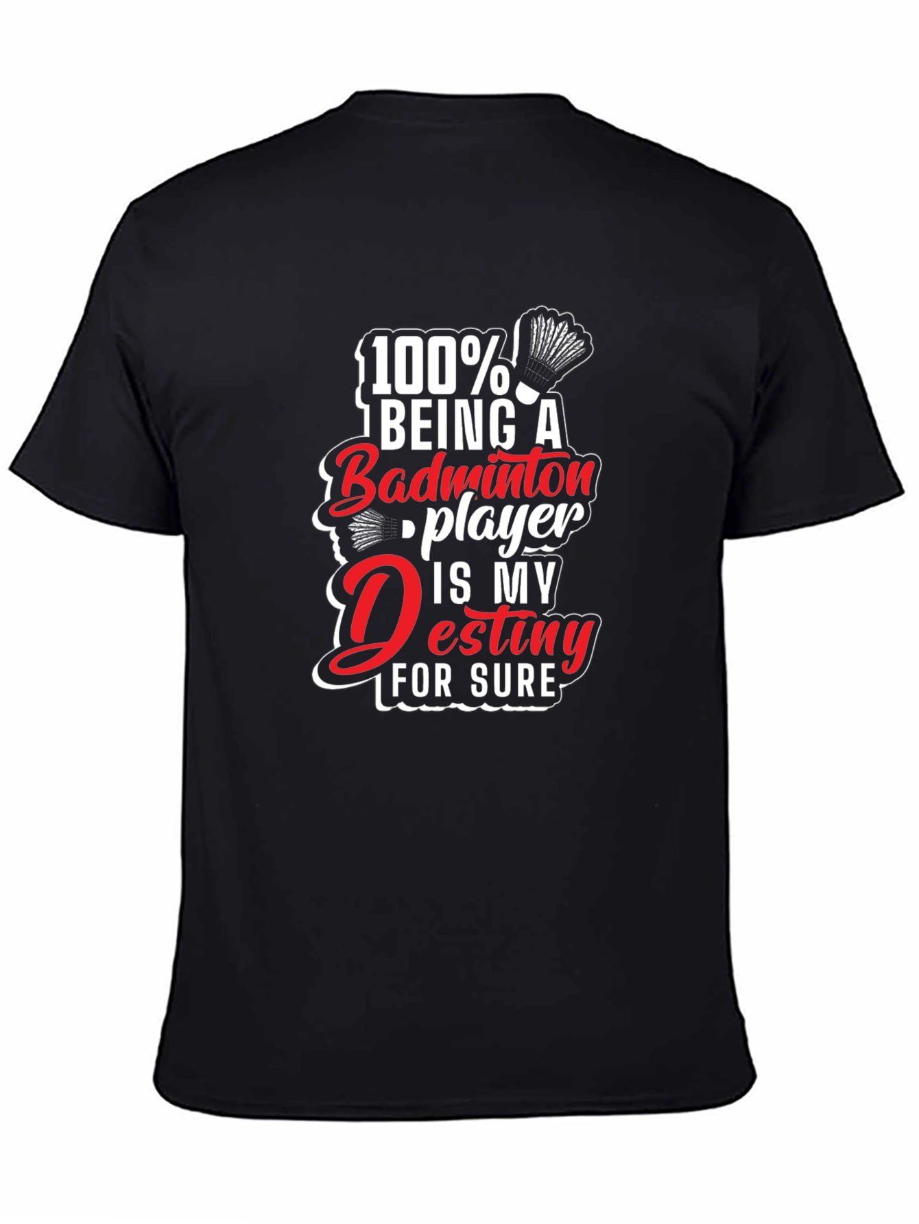 Showcase your passion for badminton with this eye-catching graphic tee. Made from soft, breathable black cotton, this t-shirt features a bold design that reads "100% Being a Badminton Player is My Destiny For Sure", complete with a badminton birdie graphic. The vibrant red and white lettering pops against the dark background, making a stylish statement on and off the court. Perfect for casual wear, badminton practice, or showing off your love for the sport. This tee is a comfortable and fashionable way to express your dedication to badminton. Get yours today and embrace your destiny!