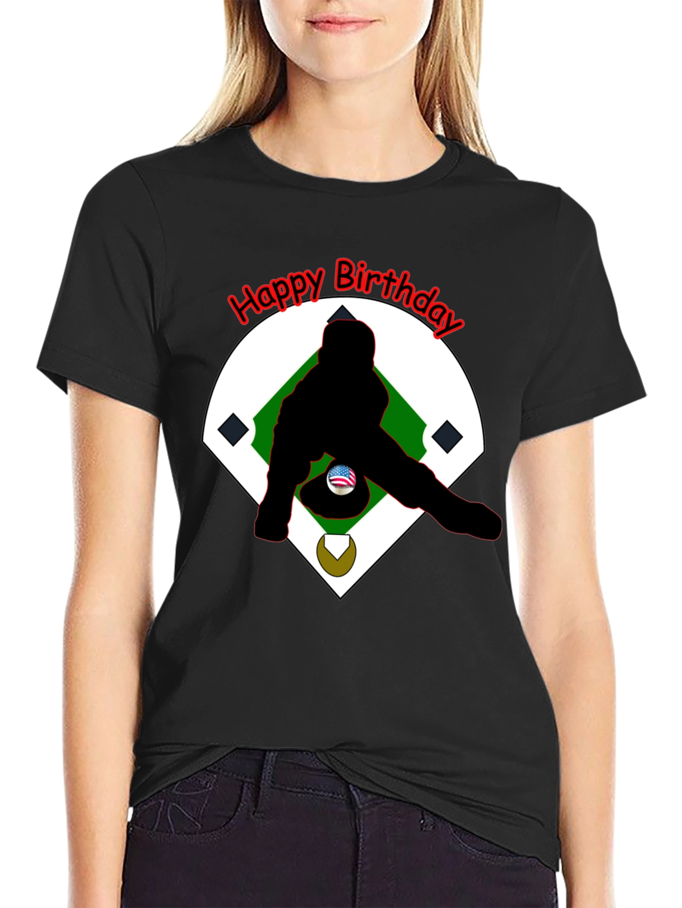 Celebrate a birthday with this unique baseball-themed t-shirt! This eye-catching tee features a baseball diamond graphic with a batter silhouette, set against a classic black backdrop. Above the diamond is the phrase "Happy Birthday". The design is ideal for baseball fans and players. Made from comfortable materials, this t-shirt is perfect for casual wear, sports events, or birthday parties. Show your love for the game and celebrate in style with this awesome tee!