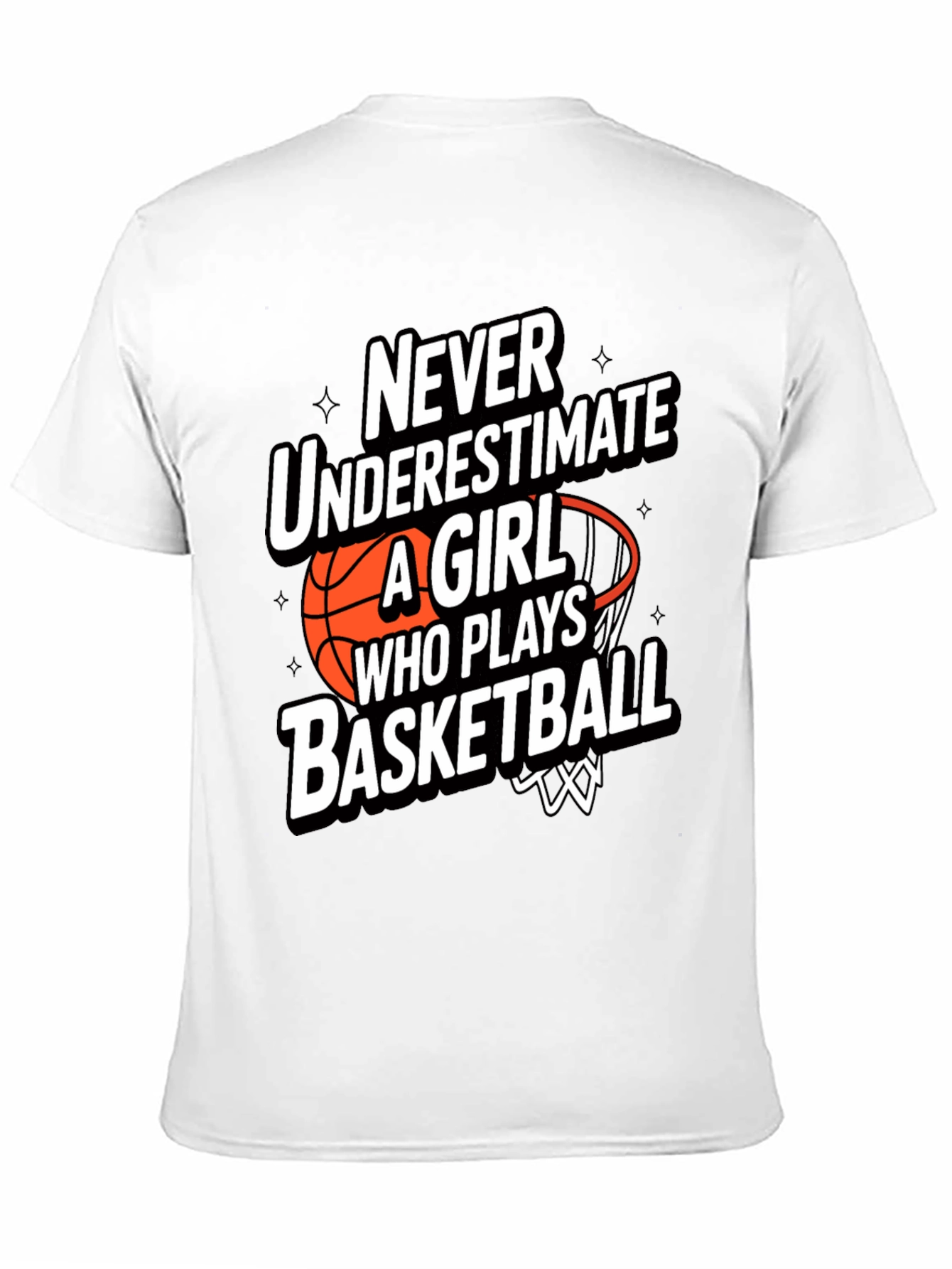 Show your love for basketball with this stylish black t-shirt. The shirt features a bold graphic print that reads "Never Underestimate a Girl Who Plays Basketball," incorporating a basketball and hoop into the design. Made from a comfortable fabric, this tee is perfect for casual wear, sports events, or hitting the court yourself. It's a great way to make a statement and celebrate the strength and skill of female basketball players. This t-shirt is an ideal gift for basketball enthusiasts and athletes alike.