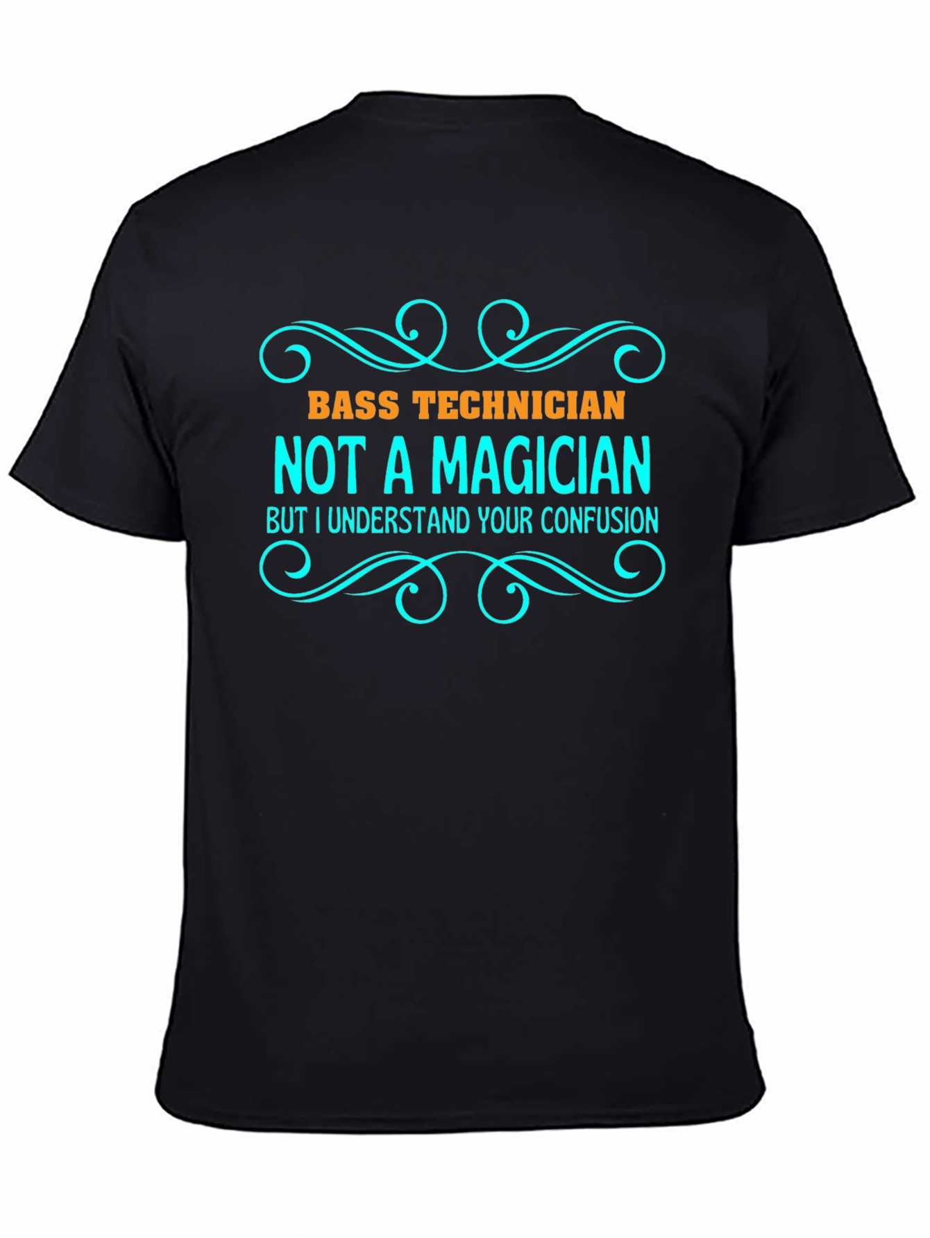 Show off your sense of humor with this unique "Bass Technician" graphic t-shirt. The bold design features eye-catching text that reads "Bass Technician NOT A MAGICIAN BUT I UNDERSTAND YOUR CONFUSION," playfully arranged with decorative flourishes. Made from a comfortable, breathable fabric, this tee is perfect for casual wear or as a statement piece at music events, band practices, or social gatherings. It's a great conversation starter and a fun way to express your passion for music and technical expertise. Whether you're a professional technician or a dedicated hobbyist, this t-shirt is a must-have addition to your wardrobe. Get yours today and let the world know you're a bass technician, not a magician!