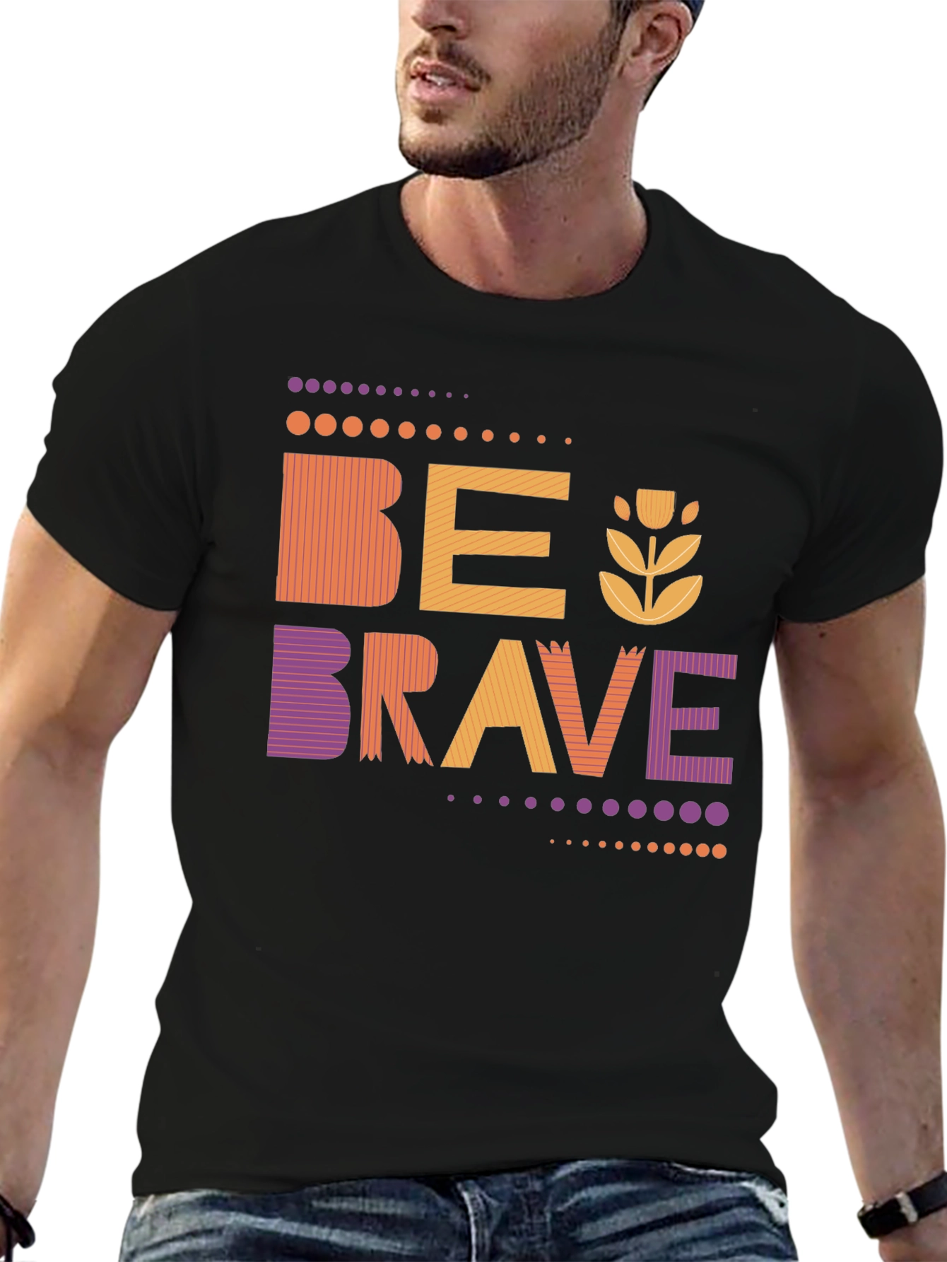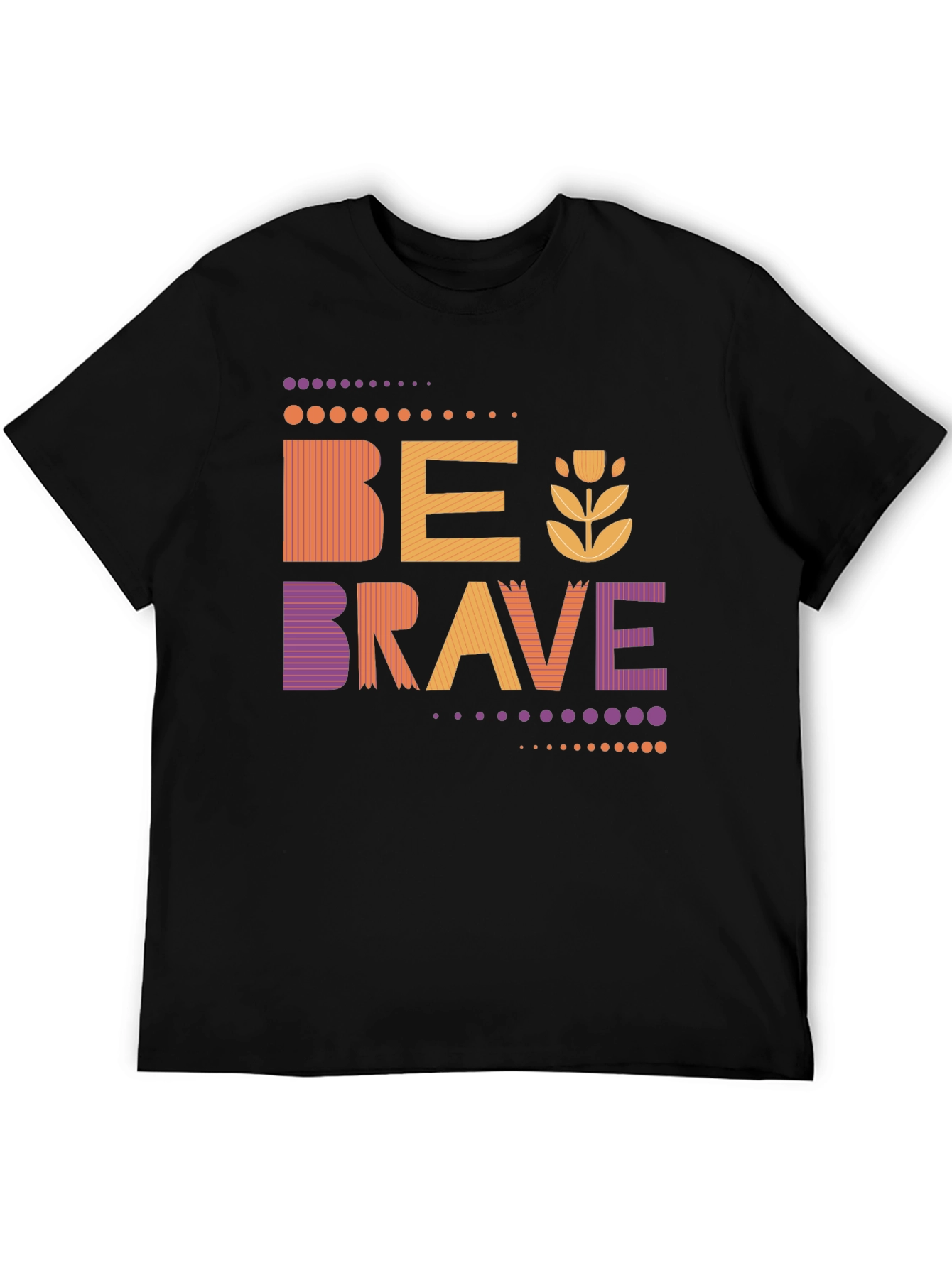 Show off your inner strength with this stylish "Be Brave" graphic t-shirt. Featuring a unique design with retro-inspired lettering and floral accents, this tee is perfect for casual wear. The vibrant colors ��� orange, purple, and yellow ��� add a pop of fun to any outfit. Made from a comfortable, soft fabric, this unisex t-shirt is ideal for everyday wear, weekend outings, or as a thoughtful gift for someone special. The positive message and eye-catching design make it a standout piece in any wardrobe. Wear your courage proudly!