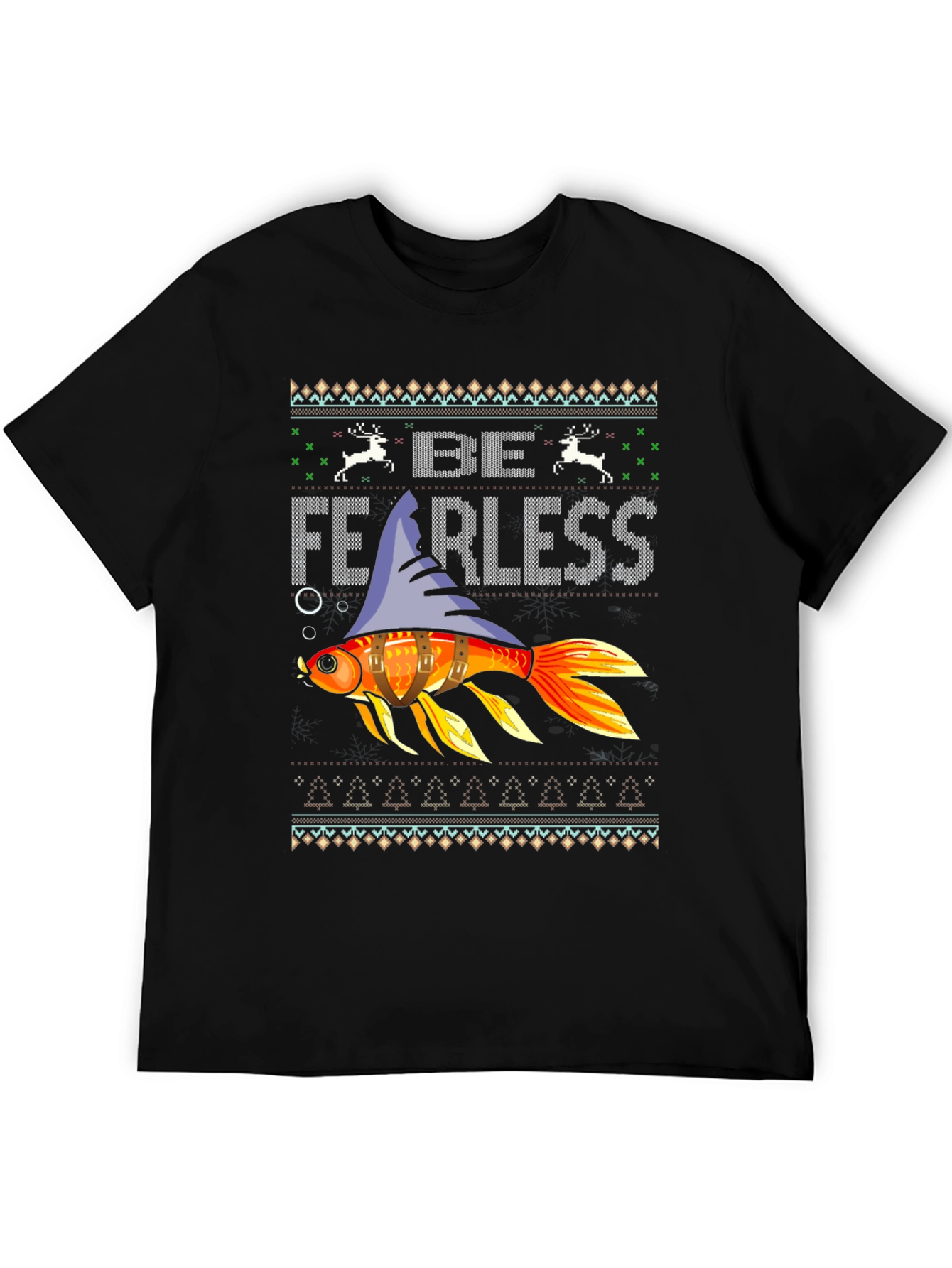 Embrace the holiday season with a touch of whimsy with this "Be Fearless" t-shirt. This black t-shirt features a unique "ugly Christmas sweater" style design. The design includes a goldfish wearing a shark fin, with the words "Be Fearless" above it. It has a patterned border above and below the goldfish. Perfect for holiday parties or casual wear, this conversation-starting t-shirt is a comfortable and festive choice for those who dare to be different. Show off your unique style with this cool holiday-themed t-shirt!
