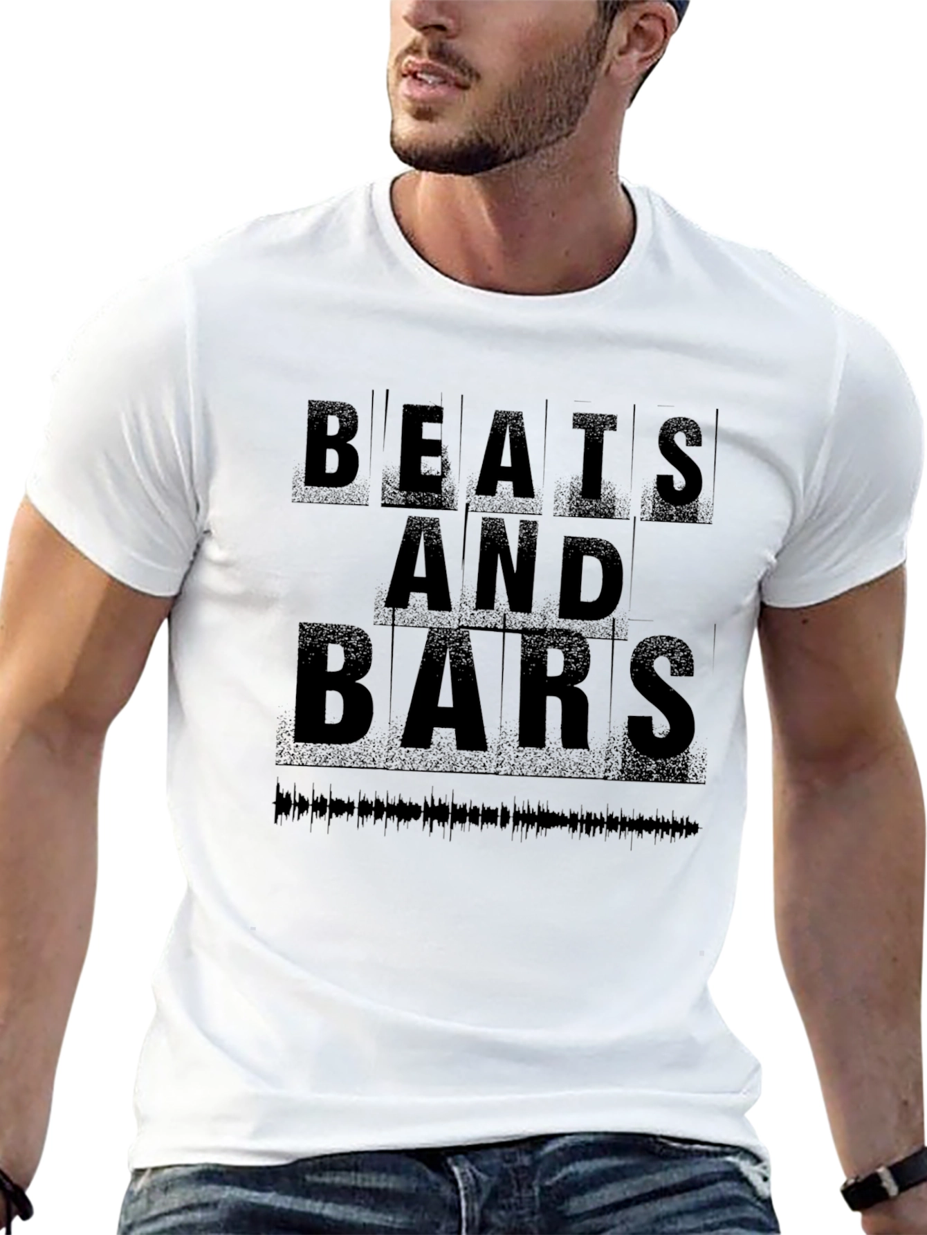Rock your love for music with this stylish black graphic tee! Featuring "Beats and Bars" printed in a cool, distressed font, this shirt is perfect for music lovers and creators alike. A sound wave graphic adds a unique touch. Made from a comfortable-looking cotton blend, it's ideal for everyday wear, concerts, or studio sessions. Show off your passion for music in style with this statement piece. Grab yours today and let the world know you live for the beats and the bars!