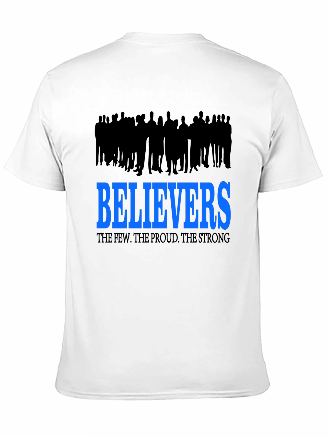 Show your conviction with this striking black t-shirt. This eye-catching tee features a bold, blue "BELIEVERS" print, underscored by the empowering slogan "THE FEW. THE PROUD. THE STRONG." Above the text, a silhouette of a crowd represents unity and strength in numbers. Crafted from a comfortable-looking fabric, this shirt is perfect for everyday wear. Whether you're making a statement or simply expressing yourself, this t-shirt is sure to inspire. Wear it with pride to events, casual outings, or anywhere you want to show what you believe in.
