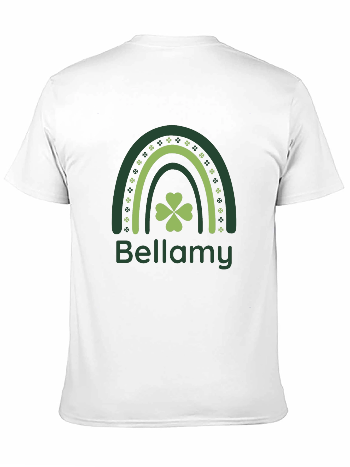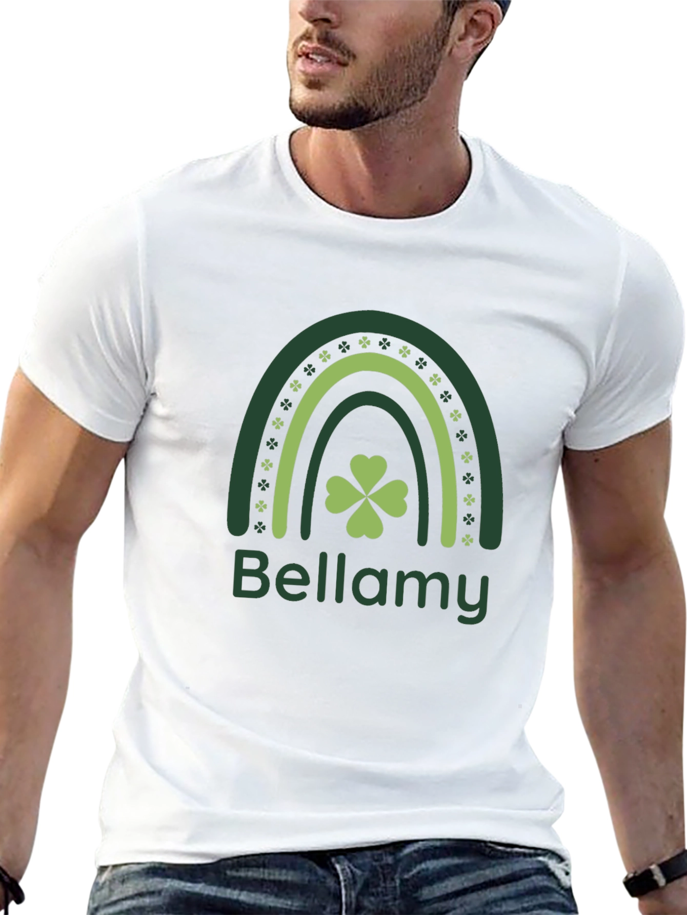 Celebrate St. Patrick's Day in style with this Bellamy tee! Featuring a festive green rainbow design adorned with lucky clovers, this shirt is perfect for spreading holiday cheer. The bold 'Bellamy' inscription adds a personal touch, making it a unique and eye-catching piece. Constructed from a comfortable, breathable black fabric, this t-shirt is ideal for parades, parties, or casual everyday wear. Show off your Irish spirit and personalized flair with this must-have St. Patrick's Day apparel!