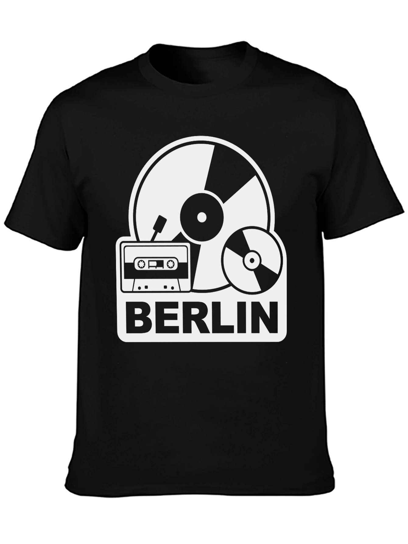Show your love for music and Berlin with this unique graphic tee. The black t-shirt features a bold white design incorporating classic music media: vinyl record, cassette tape, and compact disc. "BERLIN" is emblazoned beneath in a contrasting rectangular block. This tee is perfect for music enthusiasts, travelers, or anyone with an appreciation for retro style and German culture. Made from comfortable, breathable fabric for all-day wear. Great for casual outings, concerts, or as a statement piece. A must-have for your wardrobe or a thoughtful gift for that music-loving friend. Add a touch of vintage flair to your look!