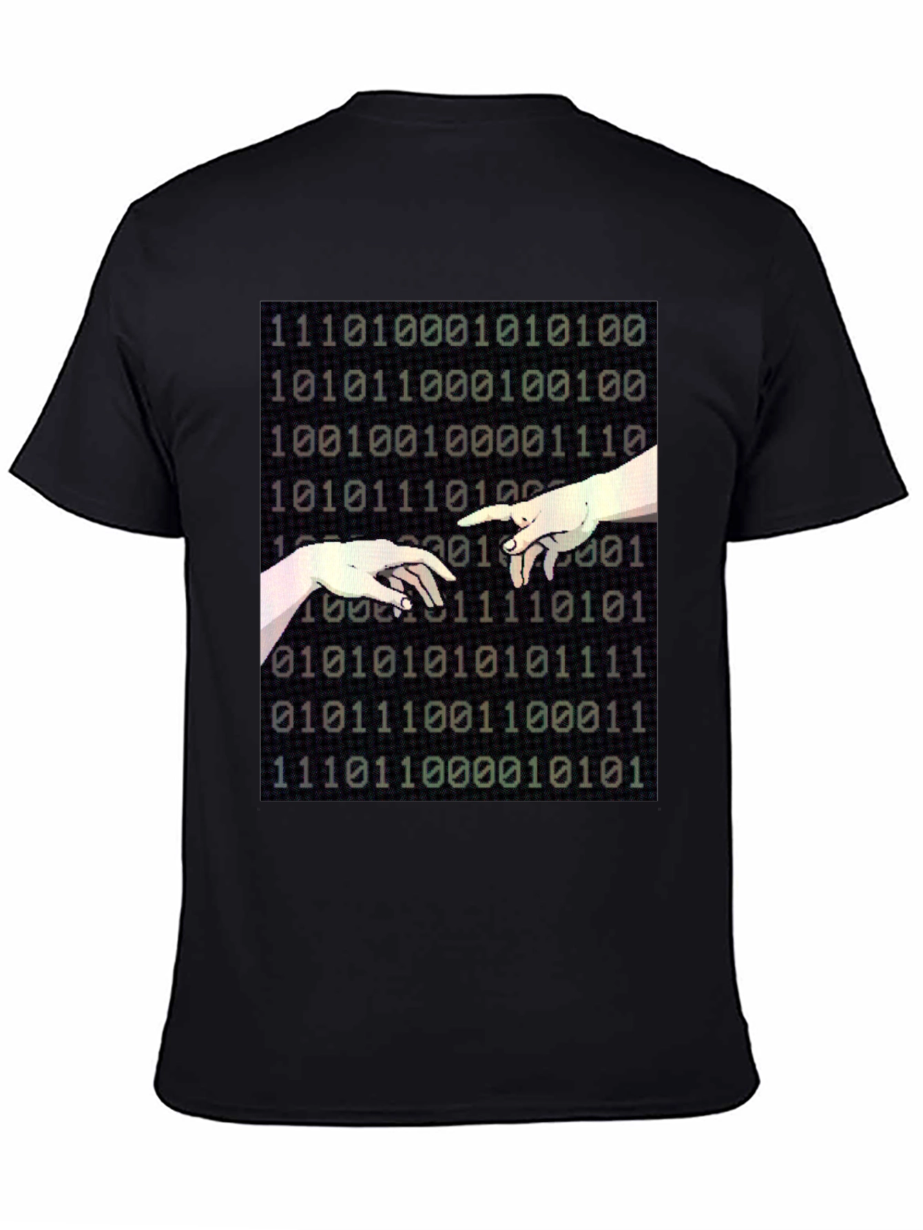 Show off your love for coding and art with this unique black T-shirt. The design features a modern twist on a classic image, blending binary code with an artistic rendering of hands reaching out. Made from a comfortable, breathable fabric, this tee is perfect for casual wear or making a statement at tech events. Stand out with this conversation-starting piece that combines technology and timeless art, making it an ideal addition to any tech enthusiast's wardrobe. It's sure to spark conversations and turn heads wherever you go.