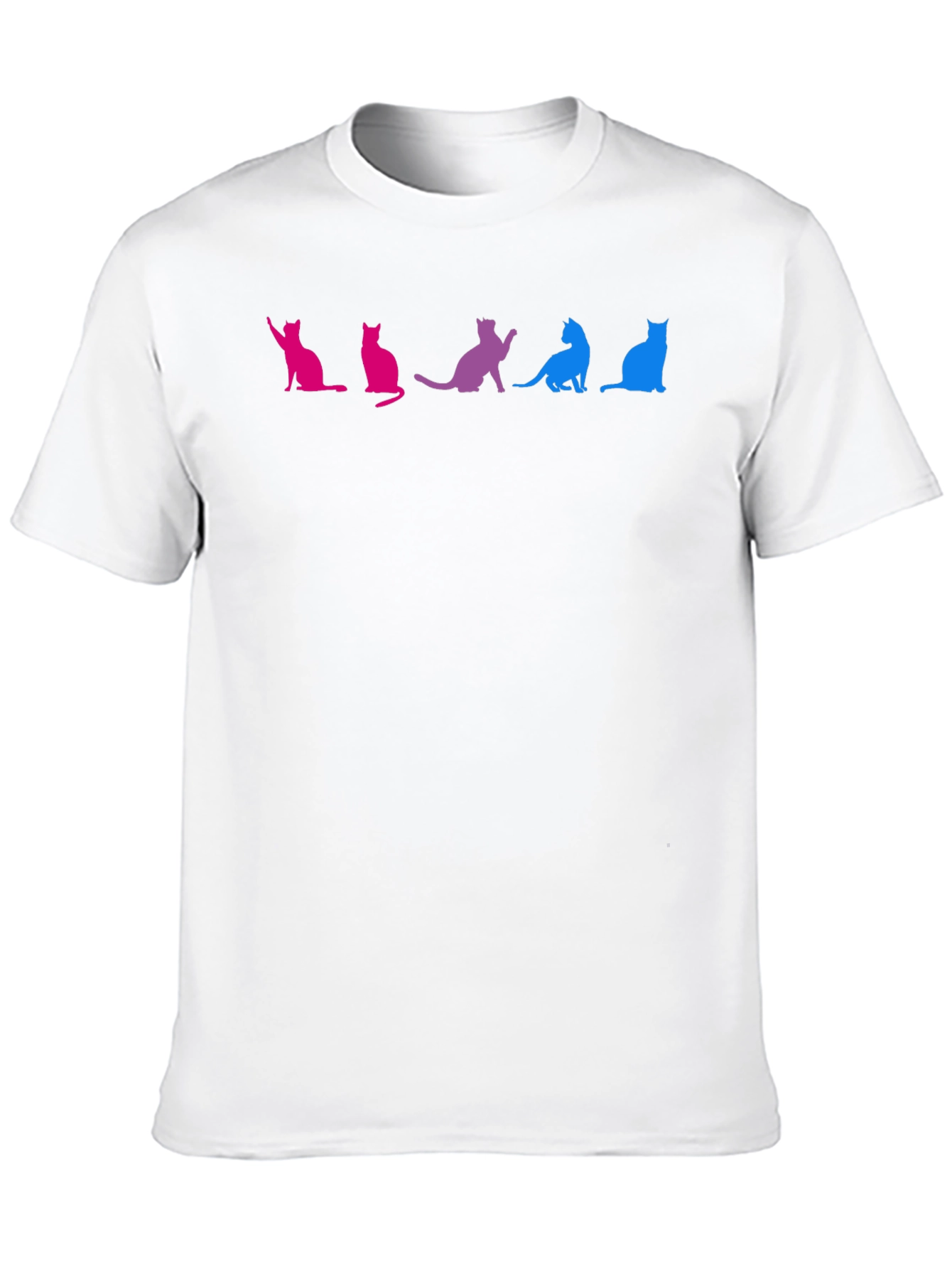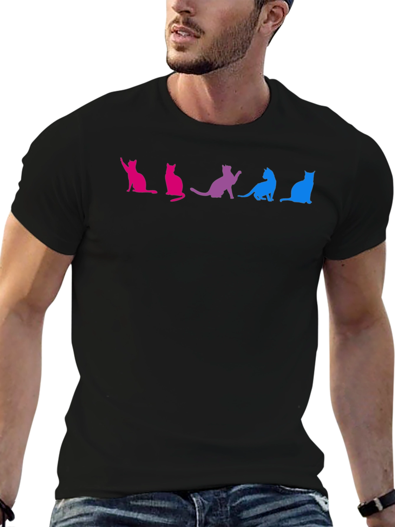 Show your pride with this unique graphic t-shirt! The shirt features a row of stylized cat silhouettes in the colors of the bisexual pride flag: pink, purple, and blue. This crew neck tee is made of comfortable, soft fabric, perfect for casual wear. The eye-catching design is ideal for making a statement at pride events, casual outings, or just expressing yourself. A great way to support and celebrate the LGBTQ+ community. Available in a classic black which makes the graphic really pop!