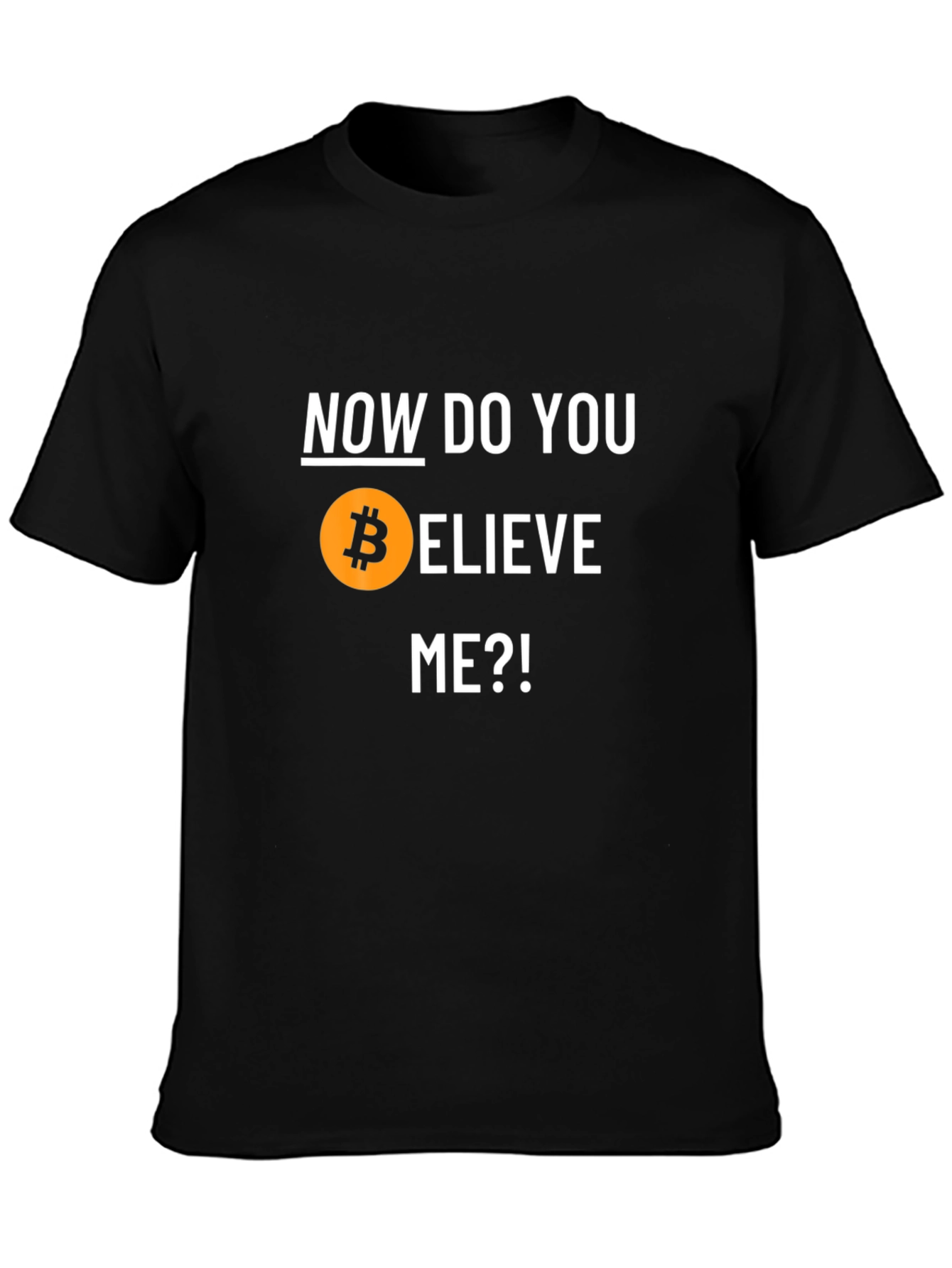 Show your support for Bitcoin with this eye-catching black t-shirt! The design features the phrase "Now Do You Believe Me?!" with the Bitcoin logo replacing the 'B' in 'Believe'. This bold statement piece is perfect for cryptocurrency enthusiasts and investors. Made from comfortable fabric, this tee is ideal for casual wear, meetups, or showcasing your crypto pride. Get yours today and let the world know you're a Bitcoin believer!